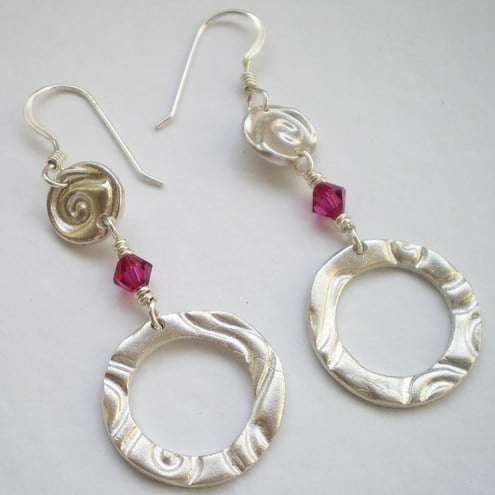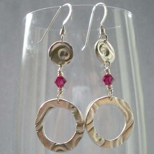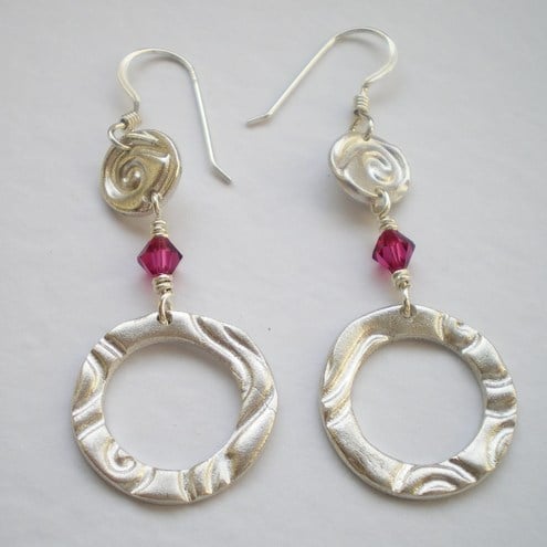 Small hand crafted art clay silver discs with a swirl pattern have tiny swarovski crystals and art clay silver hoops dangling from them. Really pretty and delicate earrings.