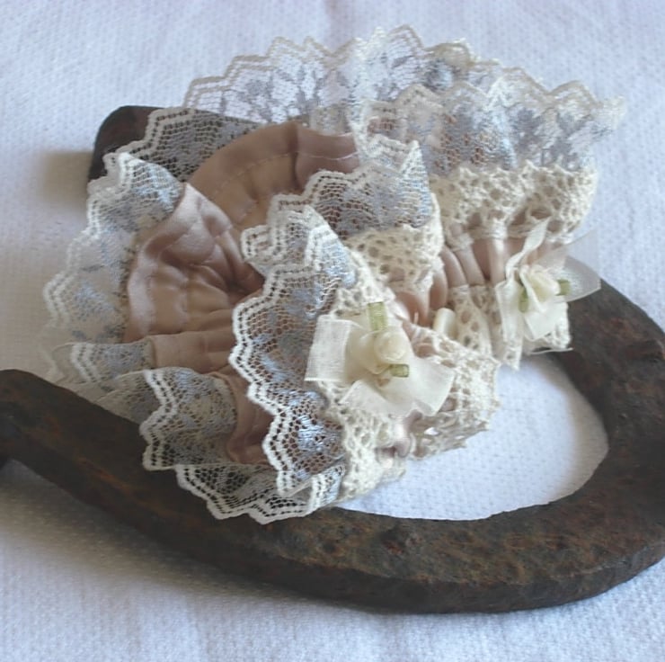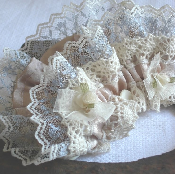 'Victoriana' is made from a silky soft , elasticated satin backing band so that it feels nice against the leg. This is trimmed along the lower edge with a Scalloped Polyester Raschel Lace (shown here in Pale Blue). Top and bottom of the garter are also trimmed with a vintage crocheted cotton lace (shown in ecru/taupe). 'Victoriana' garter is then trimmed with pretty Mother of Pearl buttons, giving it that 'shabby chic' look and dainty chiffon, handmade ribbon bows and flowers!