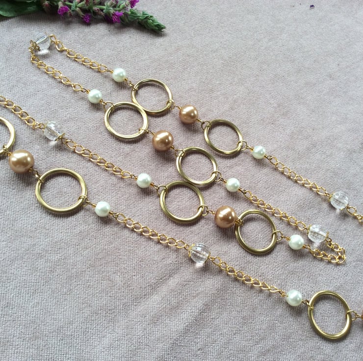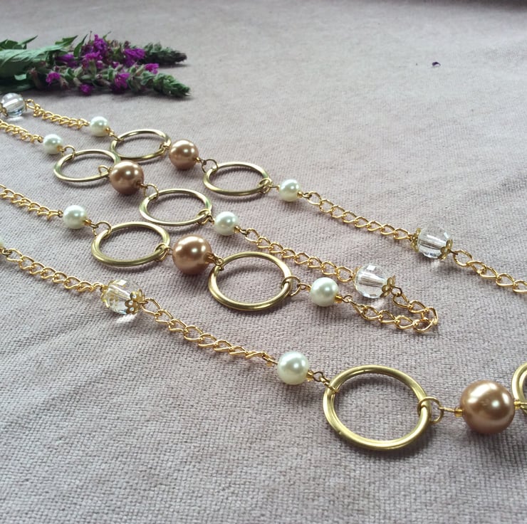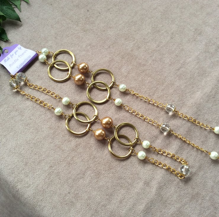Hoop loop design. Brass rings, with glass pearls in coffee and cream and acrylic faceted crystal clear beads.