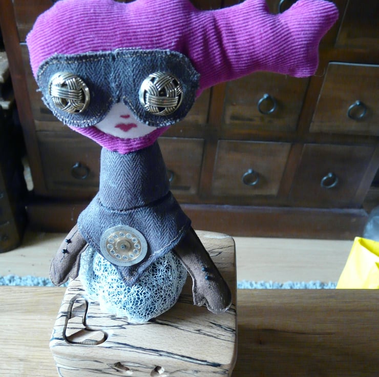 6 1/2 inch tall steam punk softy .The Aviatrix. Wearing smart leather gloves and goggles and swept away hair! Handmade using recycled/up-cycled fabrics. All softies are unique with different fabrics and embellishments. Collectors items only
