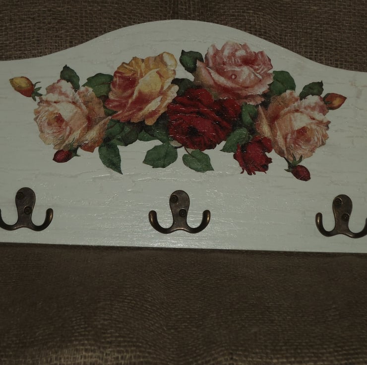 I painted this wall hook set in white with a soft crackle finish to give it a country and shabby chic look. I then decorated it with a lovely napkin decoupage design of vintage roses. I then varnished twice for protection.