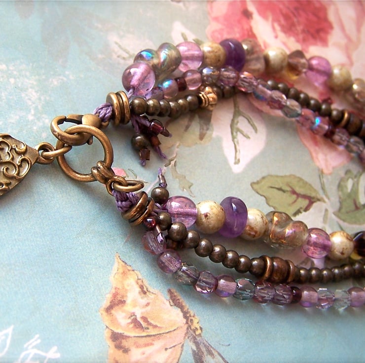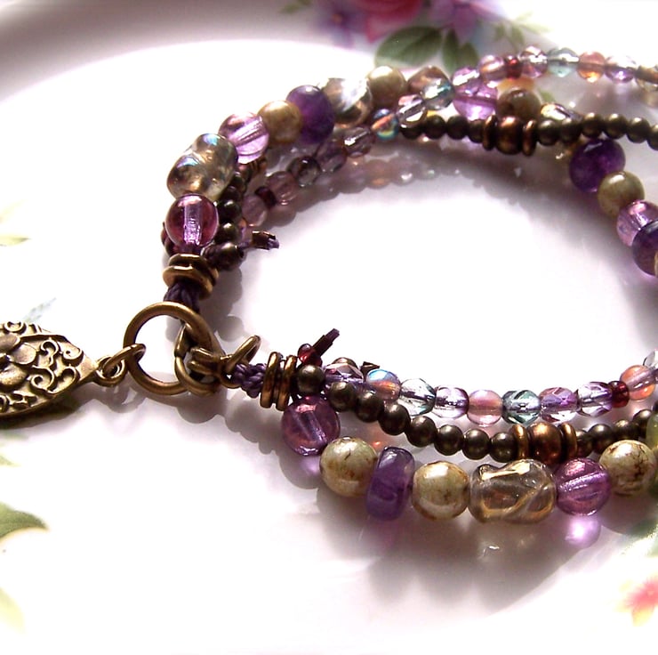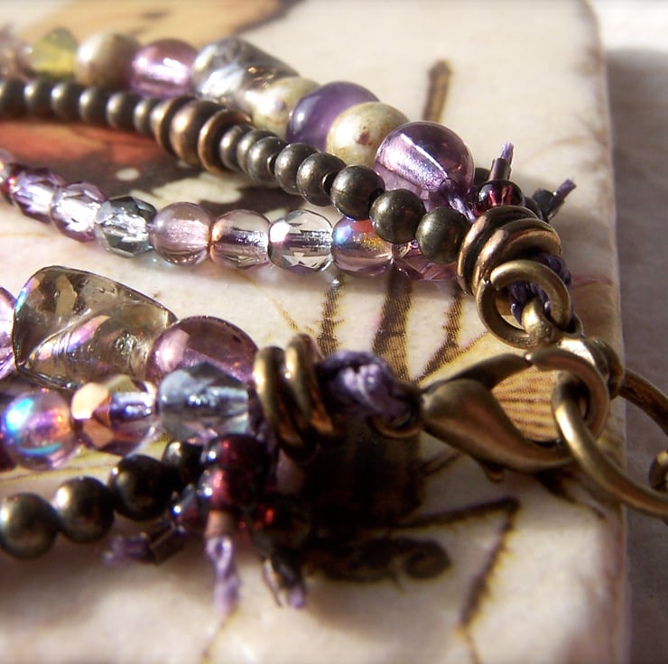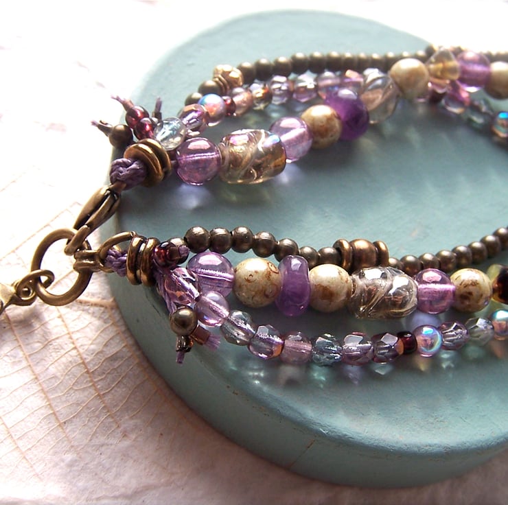 The second strand is made up mainly of Czech glass 4mm firepolished beads in subtle tones of pale green and amethyst. They have a lovely sparkle. There are also some round Czech lustred beads and tiny purple spacer beads.