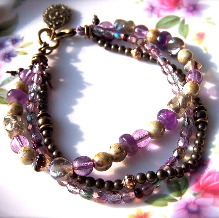 Bead Bracelet, Three Strand Lilac Brass & Green Bracelet with Flower Charm