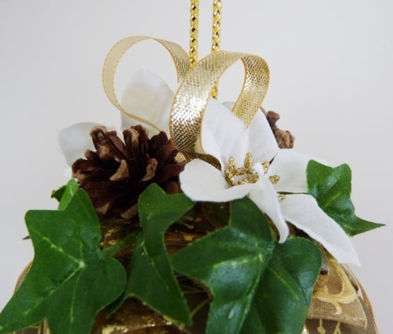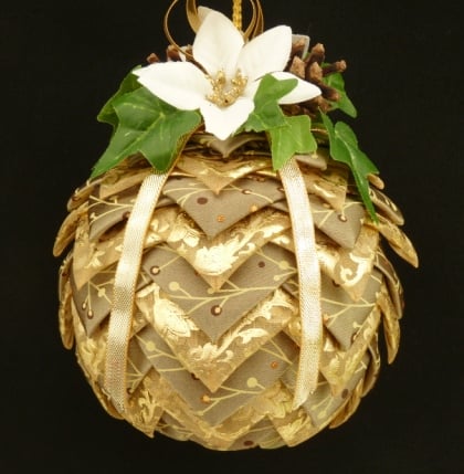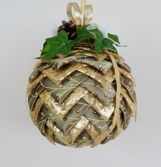 This lovely handmade Christmas Ribbon Ornament is made from a 10cm polystyrene Ball. The Ribbon I have used is almost like a Gold Jacquard print and an Olive Green print. The pieces of ribbon are cut into size and the pinned onto the polystyrene ball with small sequin pins. The top is tastefully decorated with contrasting ribbons and silk flowers in a Creamy colour.