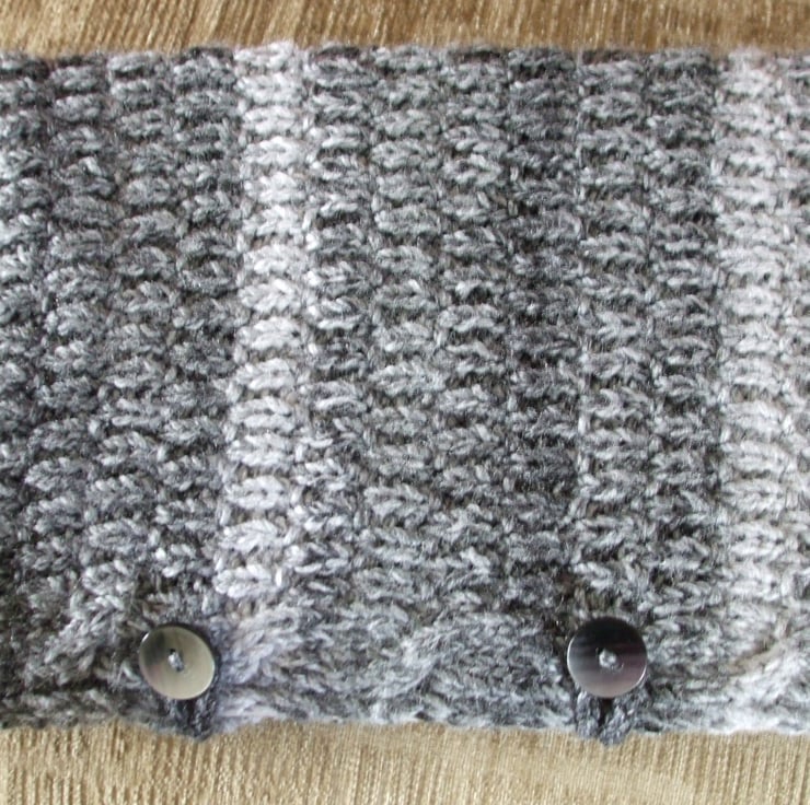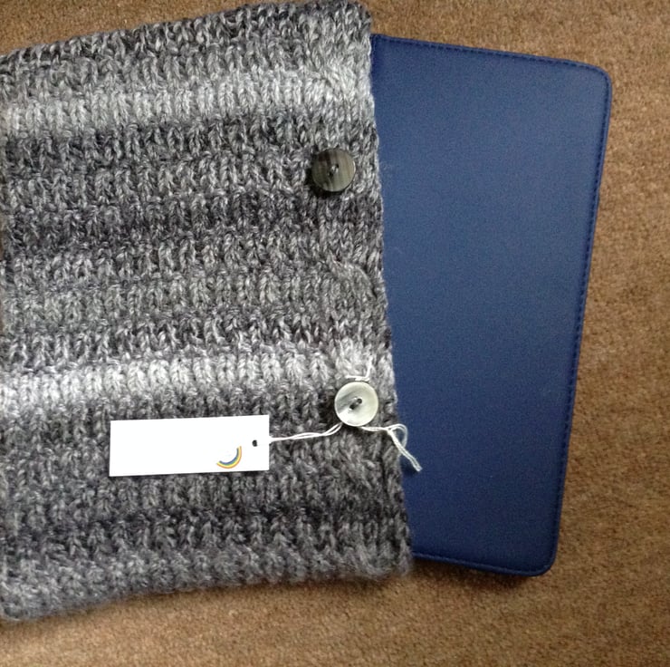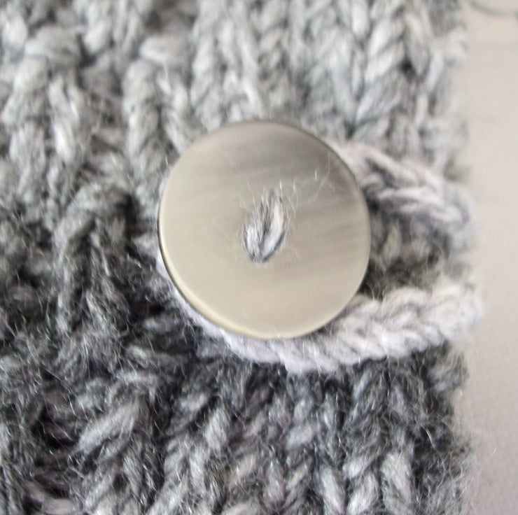 Hand knitted in a chunky, marbled grey, hard wearing acrylic yarn.
