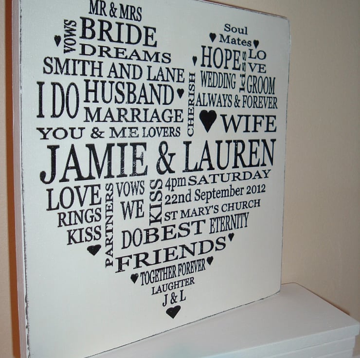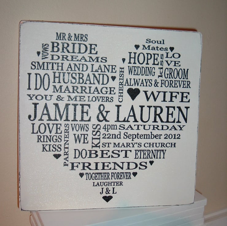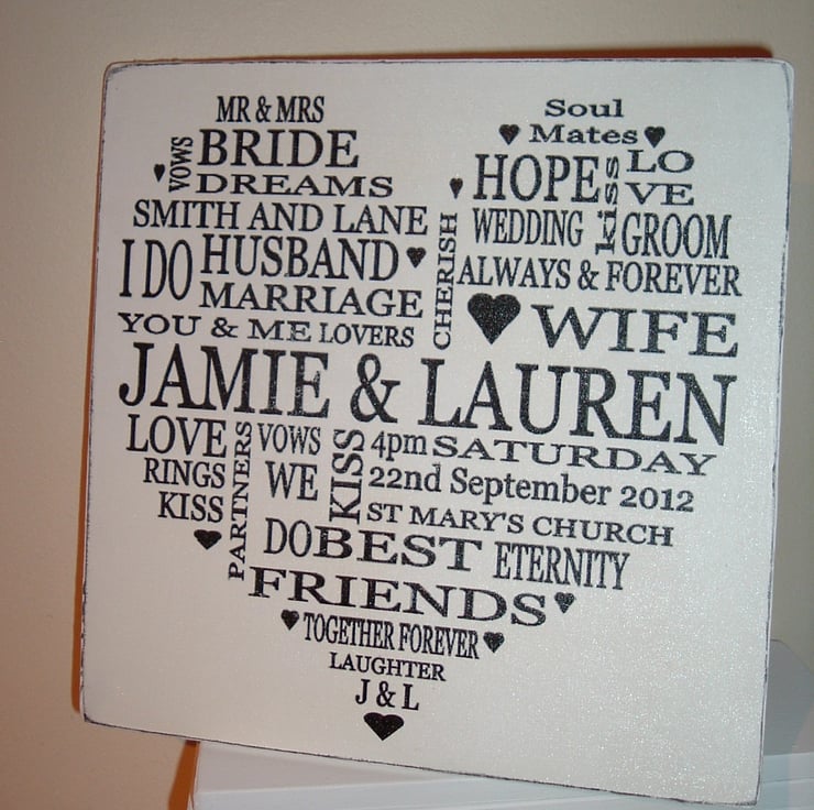 Lovely gift for the bride and groom personalised typography plaque sign, names date etc etc approx 8x8 with sawtooth clip for hanging please allow 7 days for posting thank you