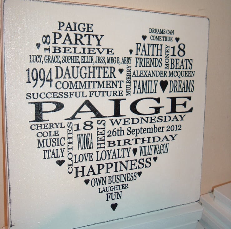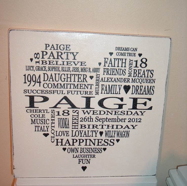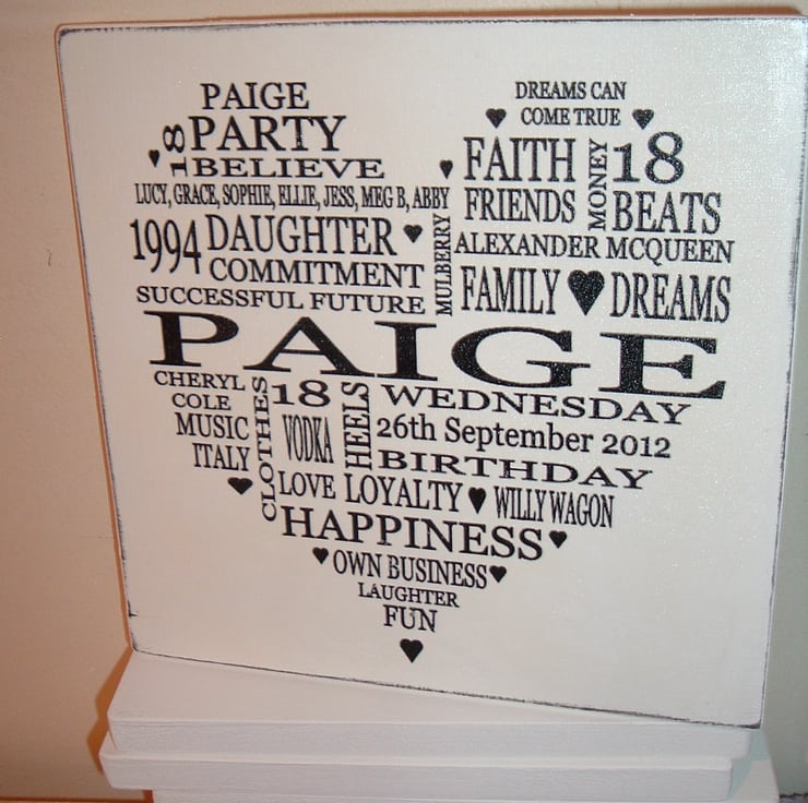 lovely gift for a 18th 21st birthday etc you can supply me with upto 14 details which i will try to fit in and a paper demo will be sent before completing to make sure everything is to your liking, my email for the info is brian-lane (at sign) live.co.uk. approx 8 x 8 inches with clip for hanging thanks