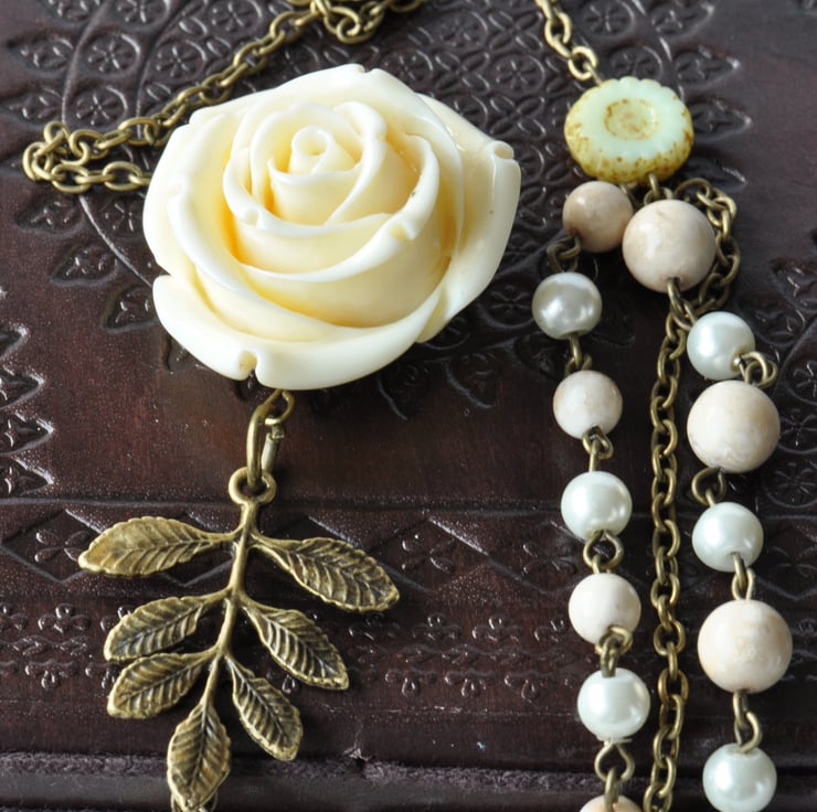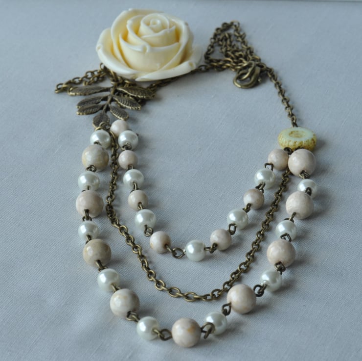 Lovely handmade necklace featuring a large lucite rose cream bead with a leaf connector nestling beneath and three strands, one plain chain and two Creamstone gemstones and cream glass Pearls with a Czech sunflower bead on opposite side and finished with one strand chain and trigger clasp.