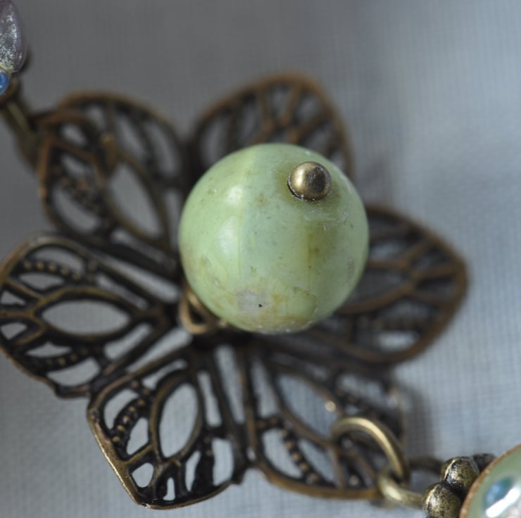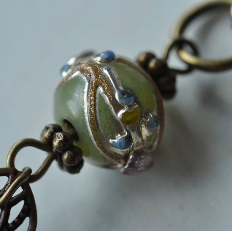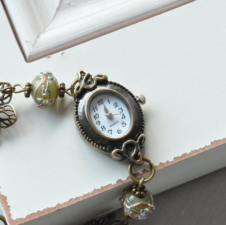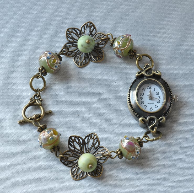 Lovely decorative oval antique bronze plated watch face with a beaded strap comprising of filigree flowers with Chrysotine gemstone beads attached and olive Venetian glass beads finished with a toggle clasp.
