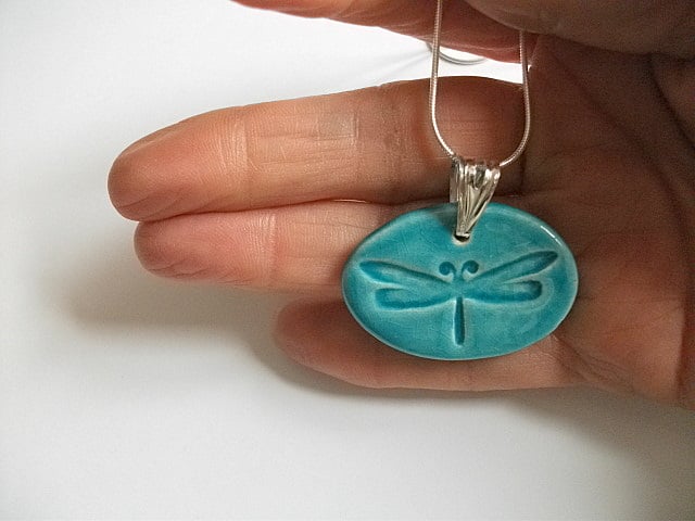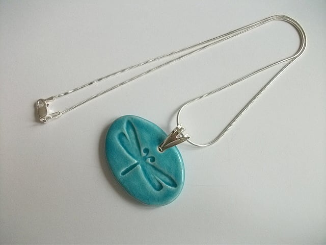 Ceramic pendant impressed with a dragonfly, glazed in turquoise, hanging from a sterling silver pronged bail on an 16 inch sterling silver snake chain.