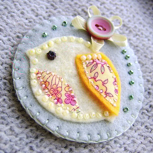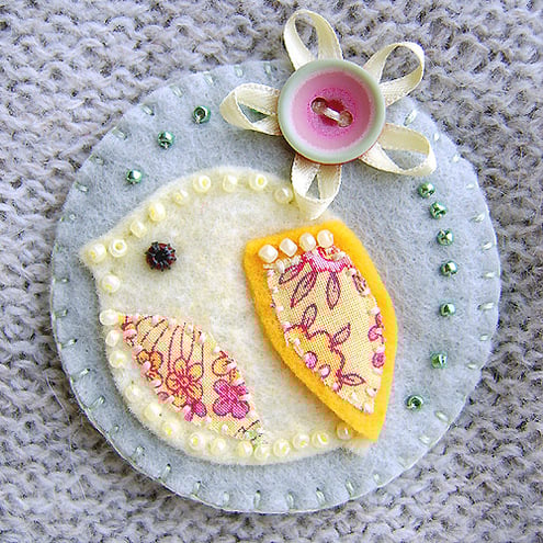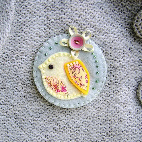 This is a lovely handmade fabric brooch. It features a little felt bird with appliqued wing and belly and is edged with pretty beads. It is mounted onto a circular grey felt base and is finished with a ribbon flower with button centre. It has a brooch backing for easy attachment.