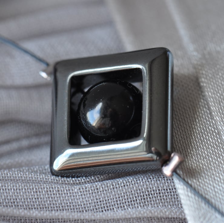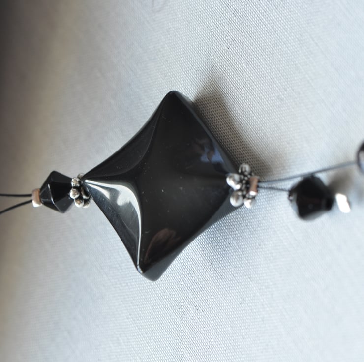 Gorgeous necklace with Black Agate rhombus shaped bead pendant featuring Czech fire polished beads, glass pearl beads and hematite hollow beads, strung on multi-strand nylon coated black beading wire.