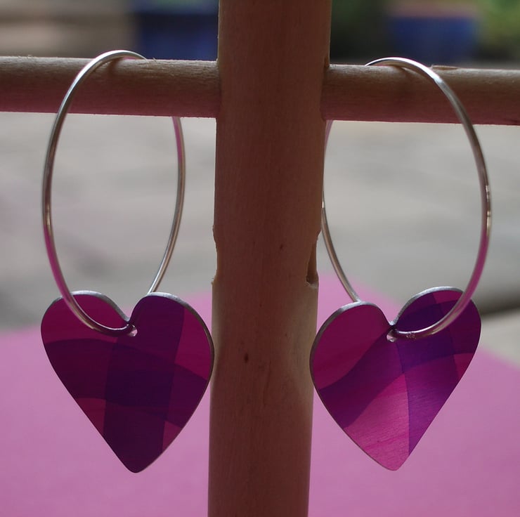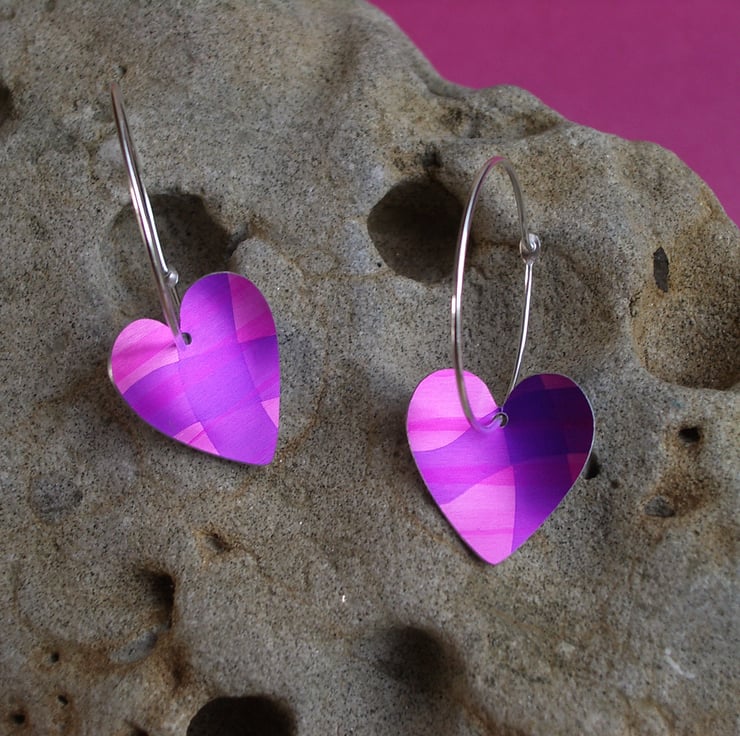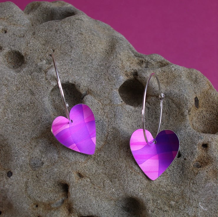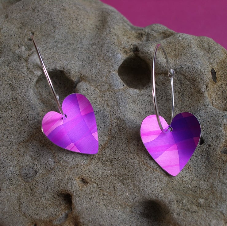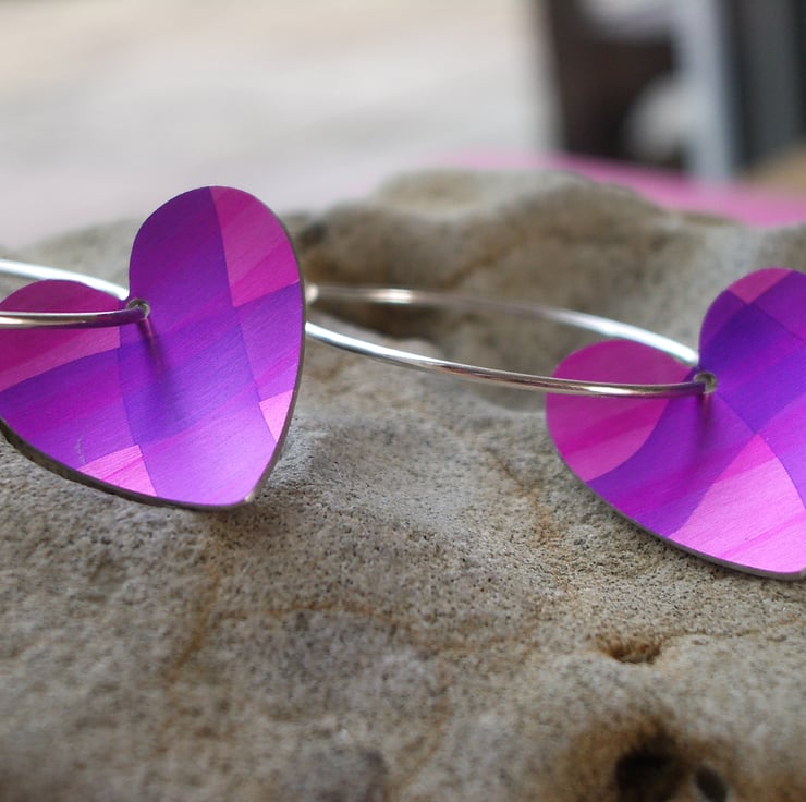 These colourful purple and pink heart shaped earrings are made from aluminium which I have coloured and then sealed, so that the dye becomes a permanent part of the metal. I then saw pierce out the heart shapes by hand.