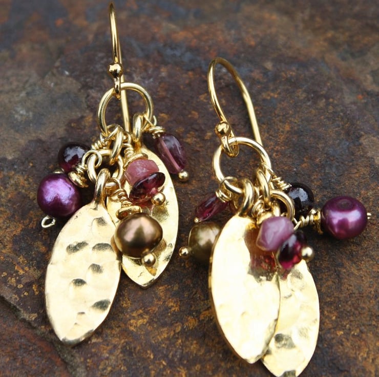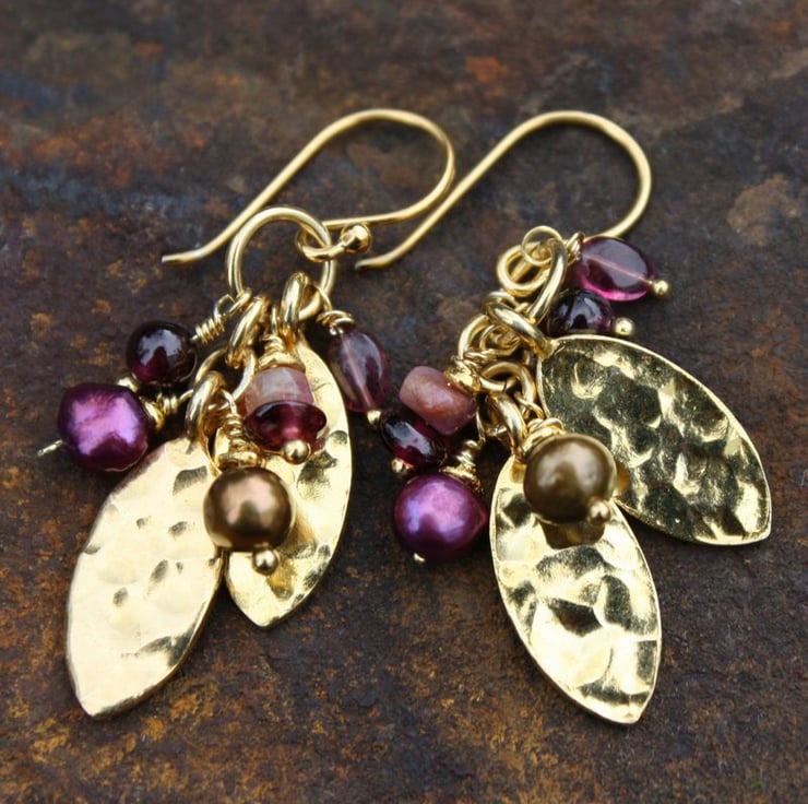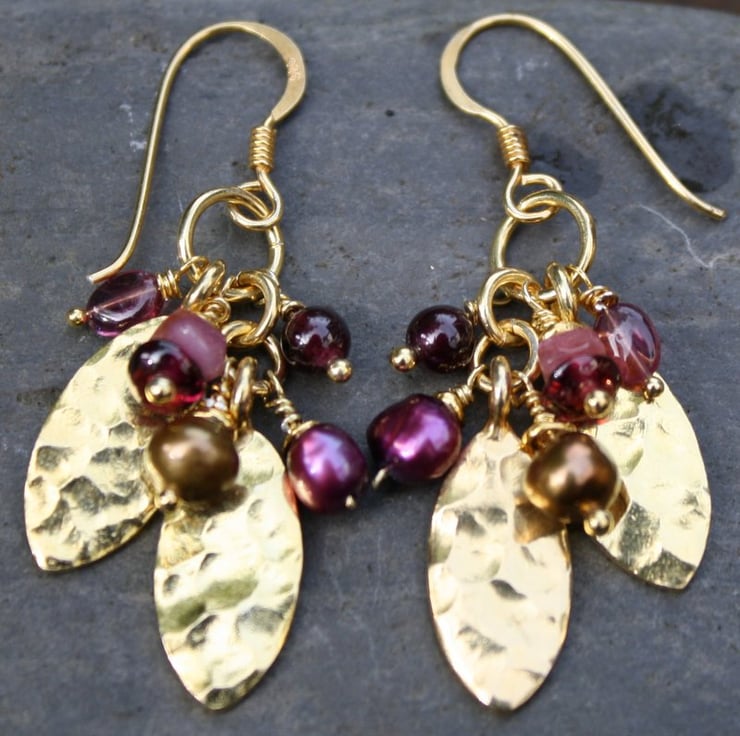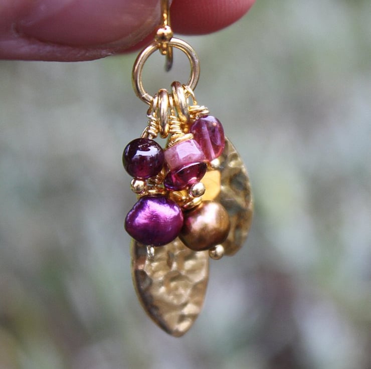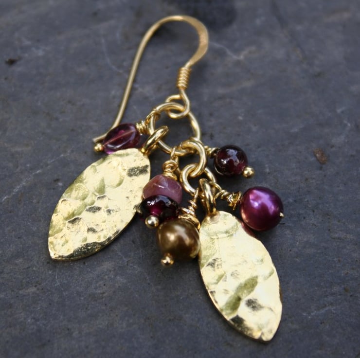 Pretty gold vermeil leaf shapes have been combined with a selection of berry coloured pearls and gemstones, that jostle for possition when worn.