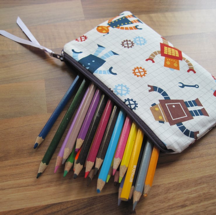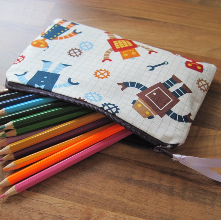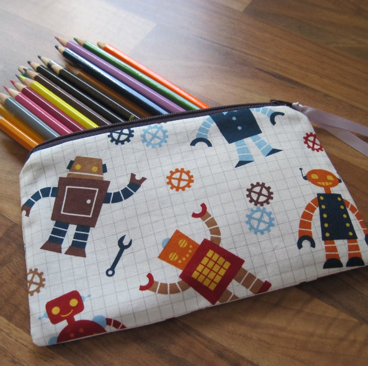 Funky Robot print fabric pencil case with a deep purple cotton lining.