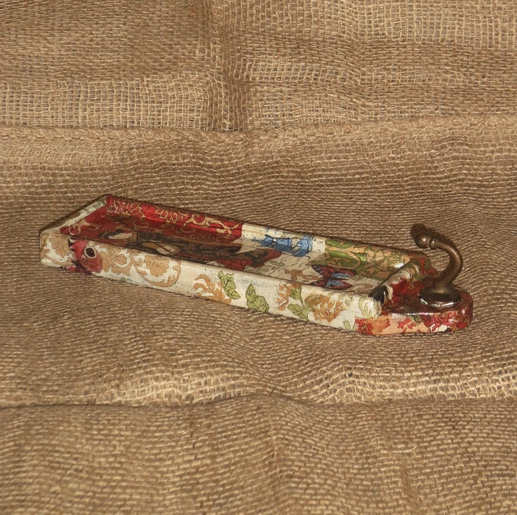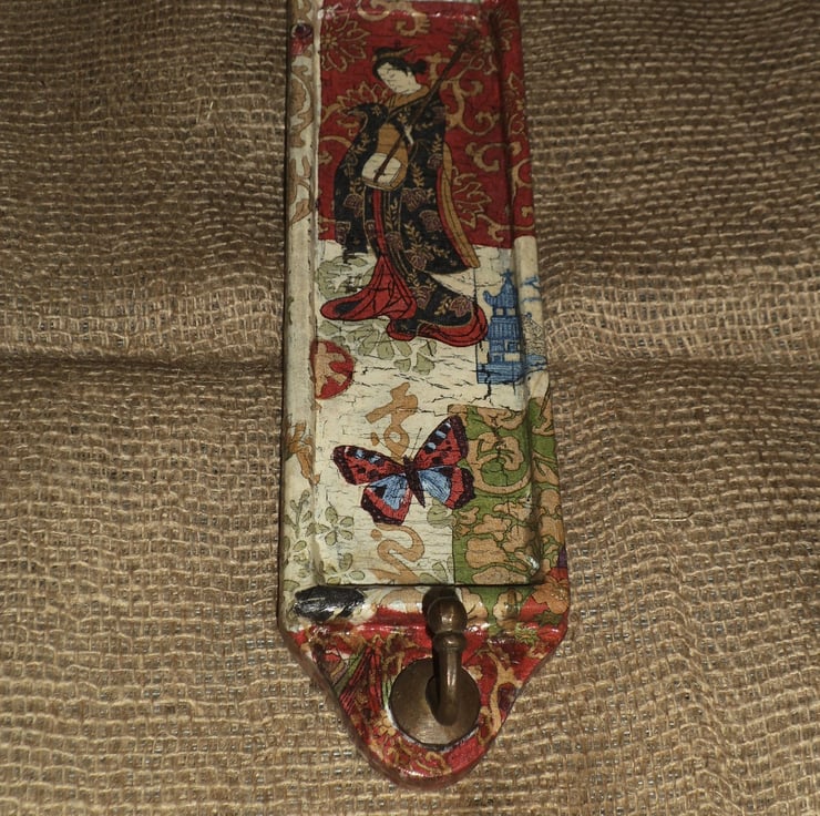 The board of the hook was painted in a brown base with a heavy white crackle to give it an aged/shabby chic look and then decorated with an unusual Japanese napkin decoupage design. I then varnished it twice for protection.