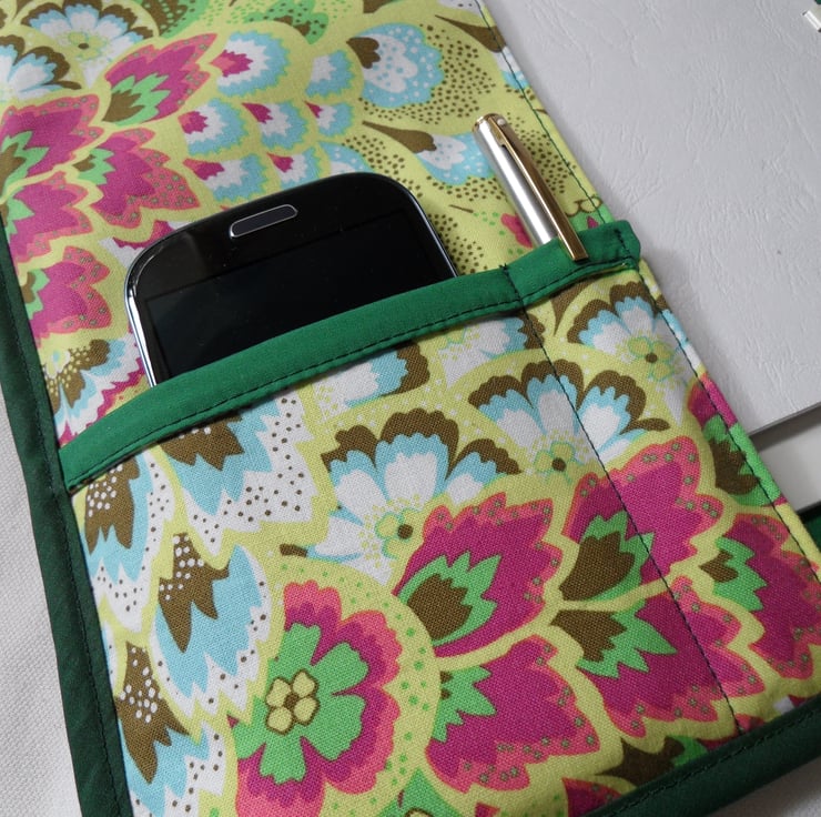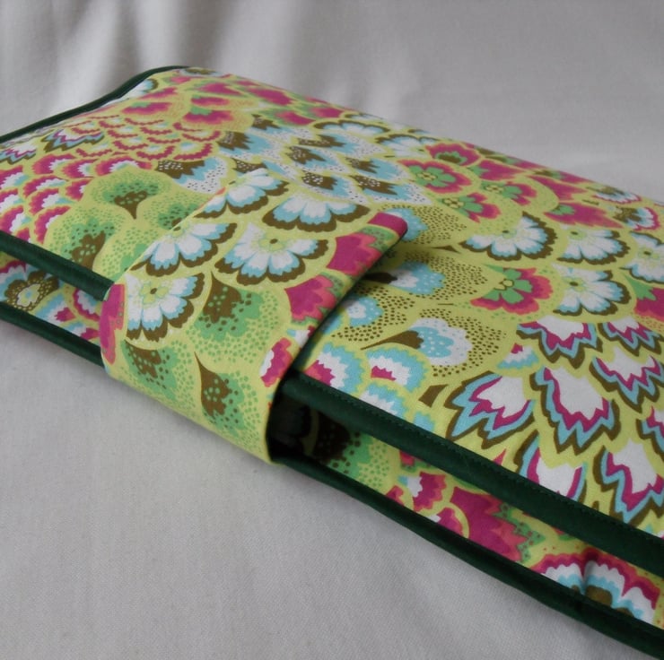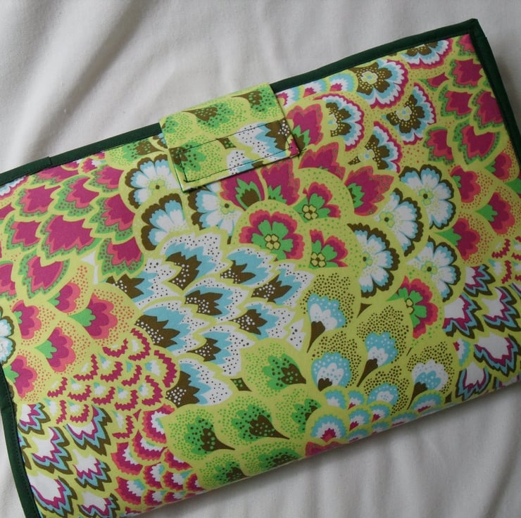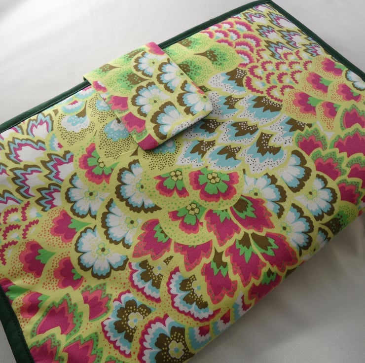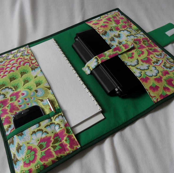 The folder is made from 100% cotton fabric called Peacock Feathers by Amy Butler. Inside the folder, there are two side pockets (one on each side). On the left side pocket, there is also a small pocket for small items such as pen and phone. On the right side of the pocket, there is a fabric strap built in to secure the item in place. The pocket will fit a 10" or 11" small computer. This folder is built with strong structure. It is comfortable to carry both with fewer items or more items inside. The folder is fastened by velcro on a fabric flap. The internal measurement is 19"x14" when the folder is opened.