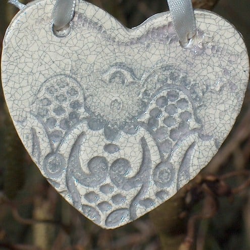 Handmade ceramic heart. With ribbon to hang. The lace detail is highlighted in a grey coloured underglaze. Bring some romance to your home! Could be hung on doors, fireplaces or simply given as a wedding gift.