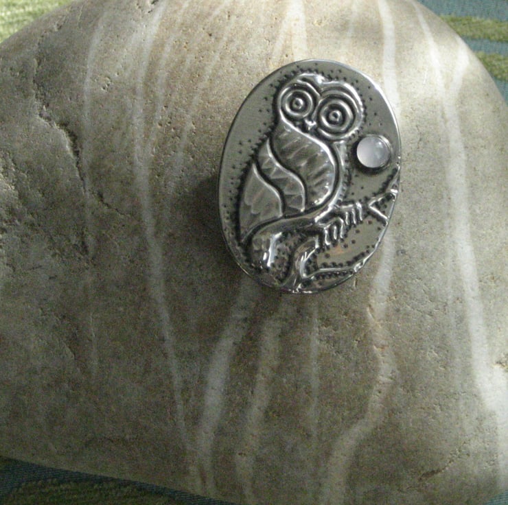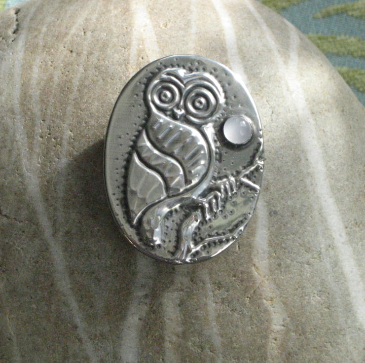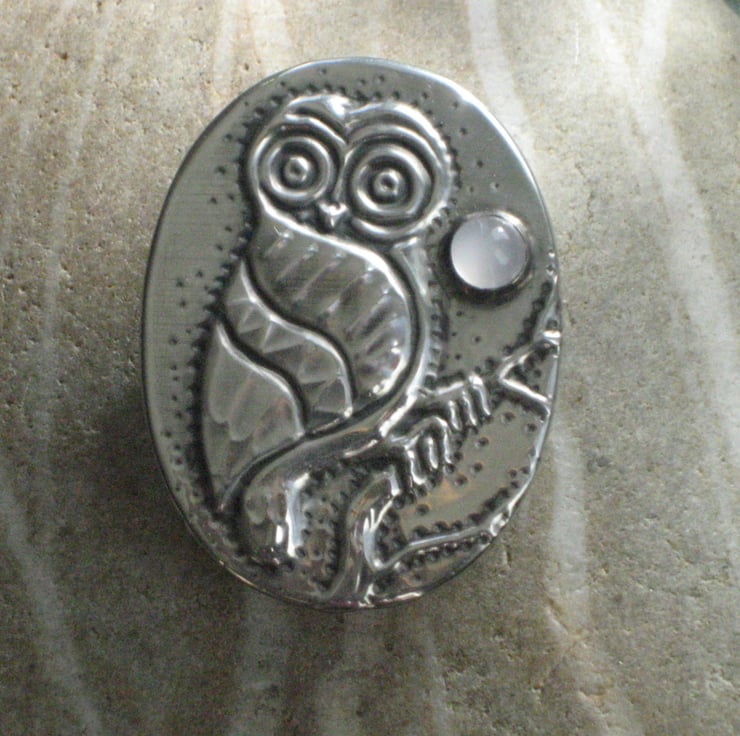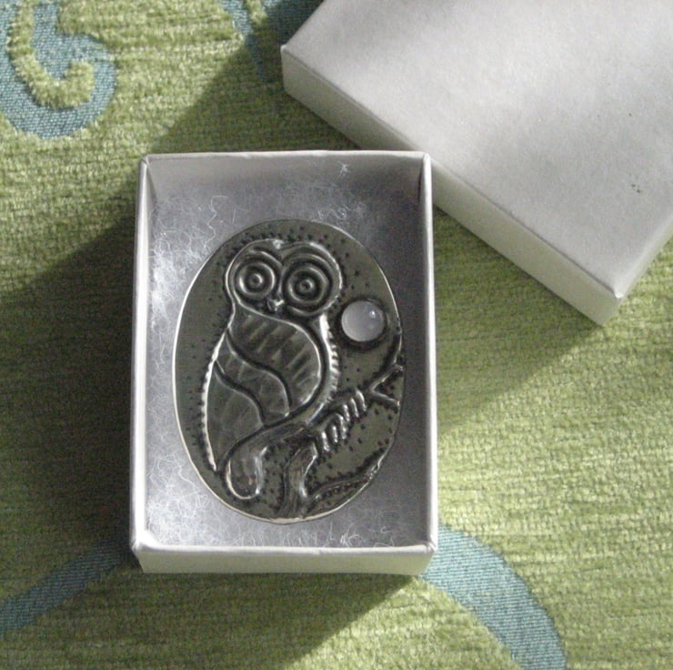 This little character sits beneath a moonstone moon, and has been handmade in modern lead-free pewter. Measuring 44mm x 33mm, it has a a 25mm pin with safety catch.