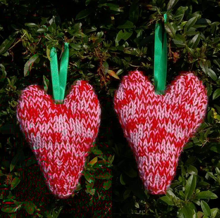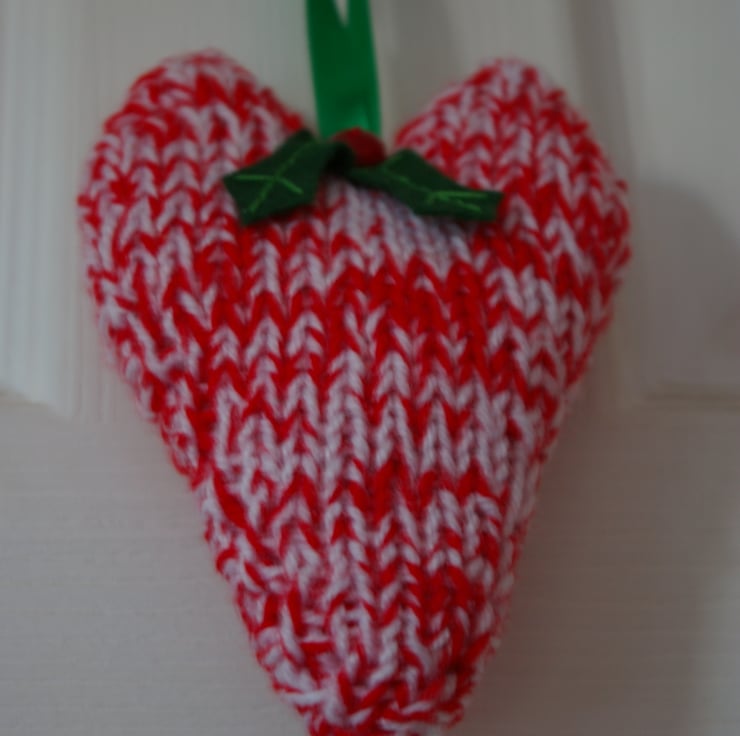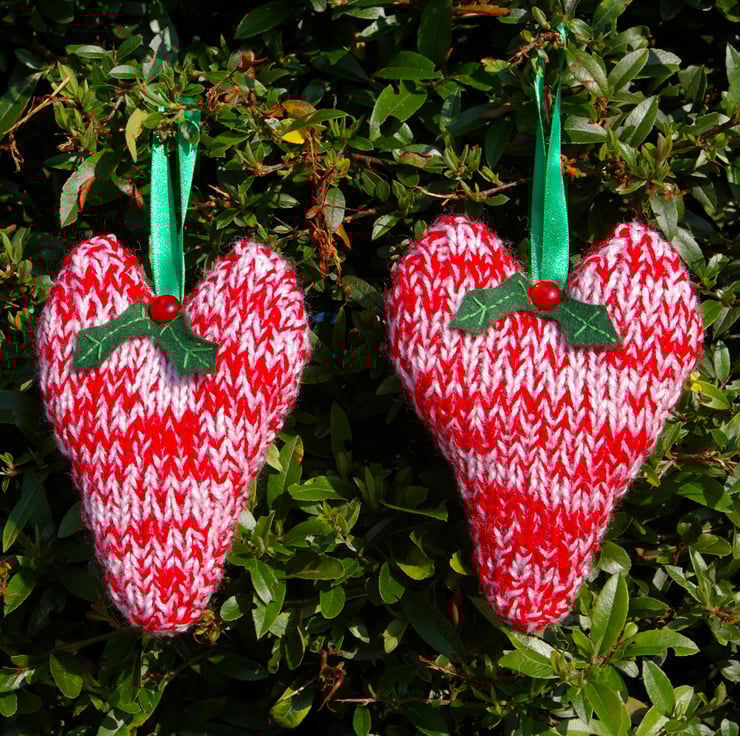 A pair of hand knitted red and white Christmas Heart Decorations. They have been carefully stuffed with a hypo allergenic stuffing, to give them a soft plump feel. They are both finished with 2 felt holly leaves with light green hand stitching and a red button. The hanging loops have been created with green ribbon. They can be hung on door handles or a large Christmas tree and are sure to help bring in that festive feeling.