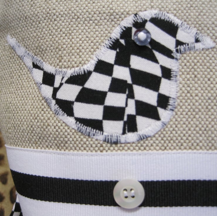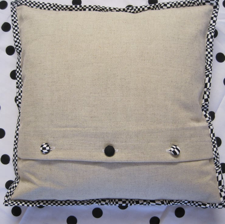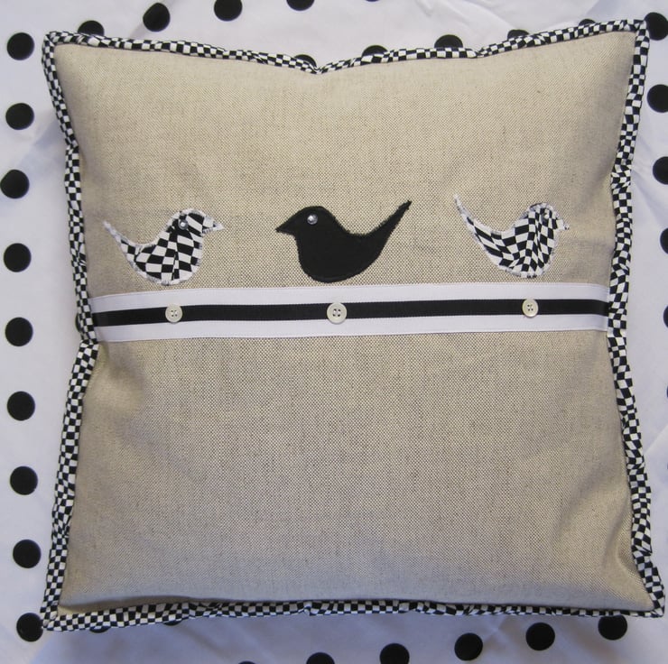Beautiful luxury linen fabric 18 “square cushion. The cushion cover has three appliqued birds with trim and button detail on the front and a matching binding around the edge. The back of the cushion cover has three handmade button fasteners. Includes polyester cushion pad.