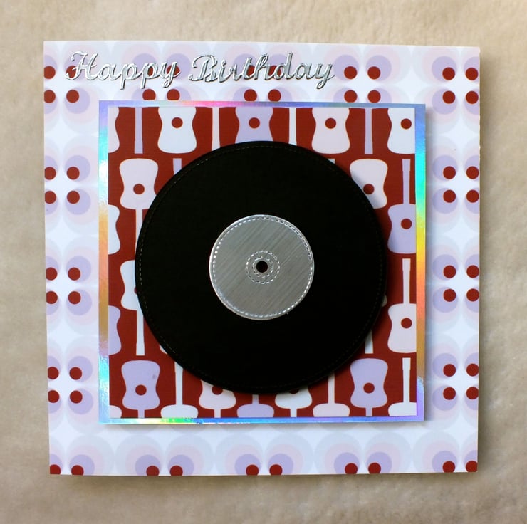 Handmade special '3D Retro Record' birthday card, size approx. 6"x6". Retro 60's and 70's design print layered with a record embellishment. Includes 'Happy Birthday' sentiment inside.