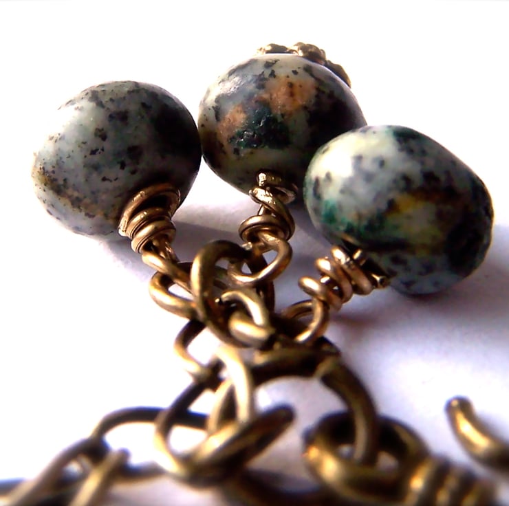 Finally, I wire-wrapped and attached three little turquoise gemstones in a lovely mottled earthy shade of greeny blue.