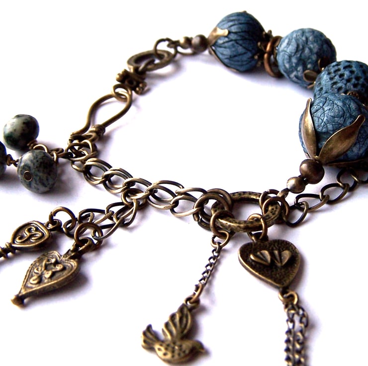 This delicate and pretty charm bracelet uses beautiful blue handmade artisan ceramic beads in a fabulous shade of denim blue, teamed with antique brass chain and charms, for a pretty, boho style bracelet.