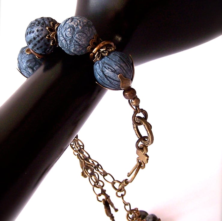 The beads are formed individually from white stoneware clay and then hand textured. Each bead is different, with a natural organic feeling that reminds me of seed pods or nuts. A natural oxide stain is used to create this unusual shade of denim blue, and the beads are left unglazed, which adds to their natural, stone-like quality.