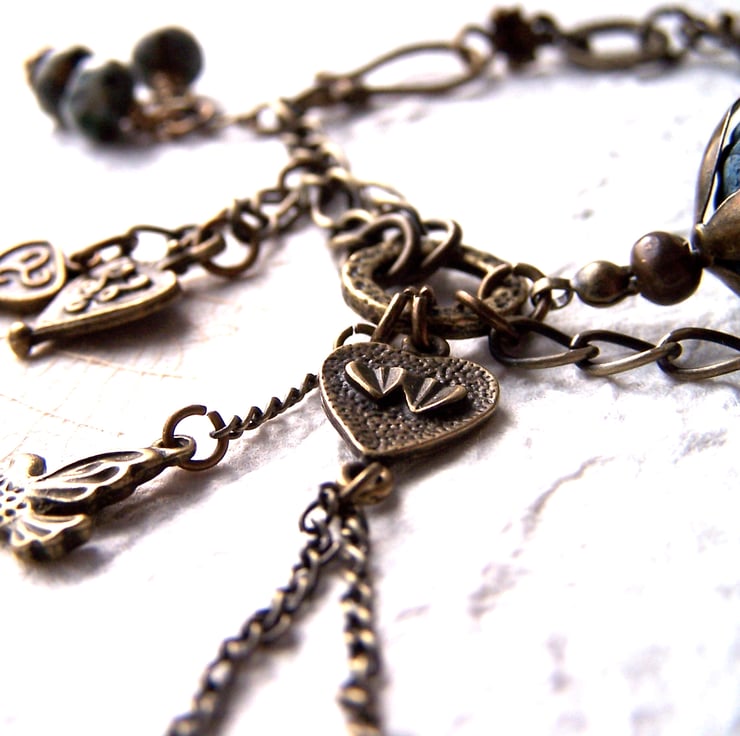 I have used antique brass finish bead caps and chain to link the beads, along with a pretty selection of brass charms, comprising hearts, a key and a bird. The antique brass finish complements the ceramic beads beautifully.