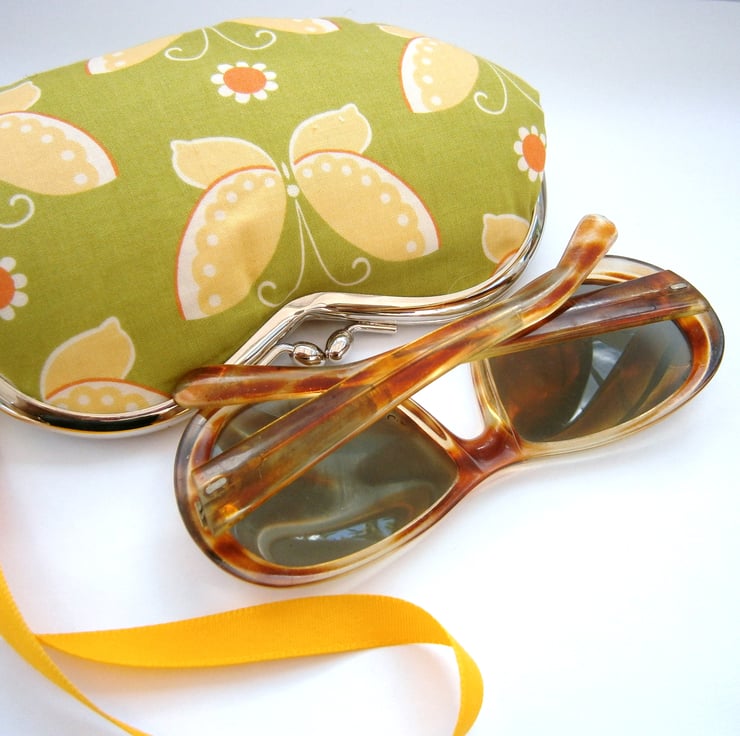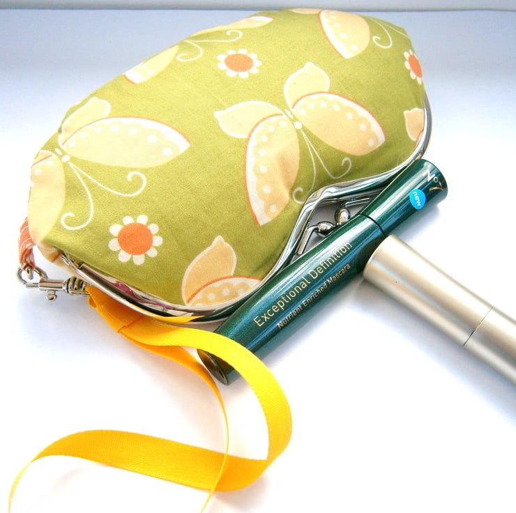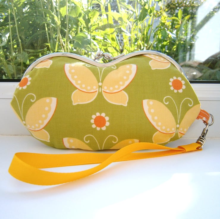 Charming little wristlet purse for sunglasses or mobile phone in pretty brown Moda butterflies fabric with contrasting orange lining and removable wrist strap. Measures approx 7x3.5