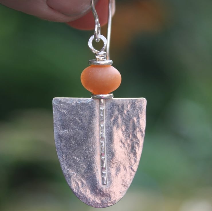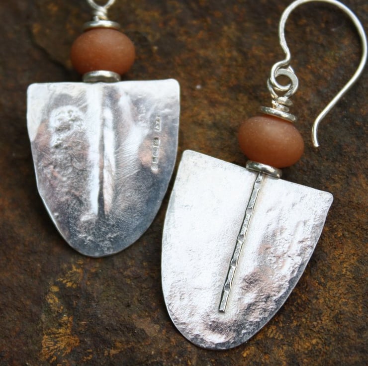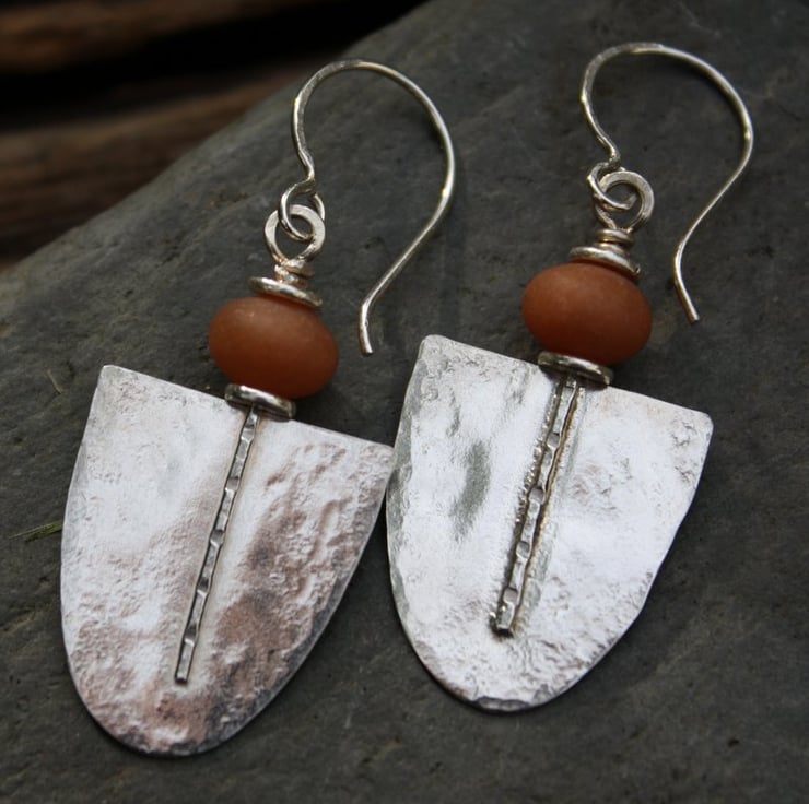 Beaten fused silver blades are topped with frosted red aventurine, hung from hand made earwires.