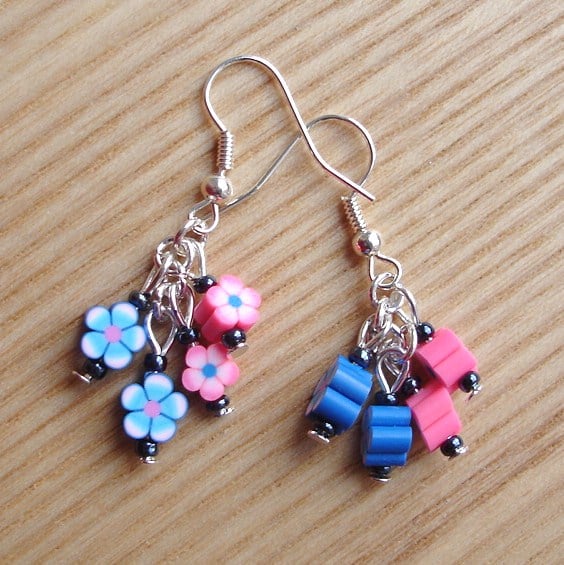 These bright earrings feature clusters of fimo flower beads. They are hung on silver plated headpins and finished off with teeny black lustre glass seed beads. Really kitsch and fun to wear.