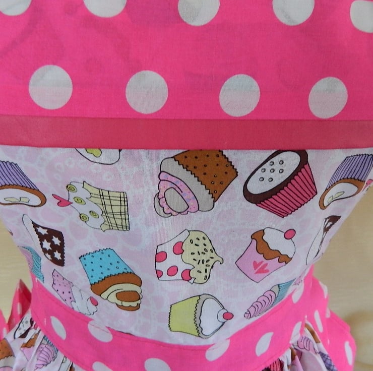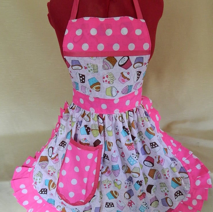 Here we have a lovely cotton rich bright pink, cupcake, retro style apron, handmade in house to our own design. (see photos). Adjustable neck and waist ties so will fit up to a size 22.