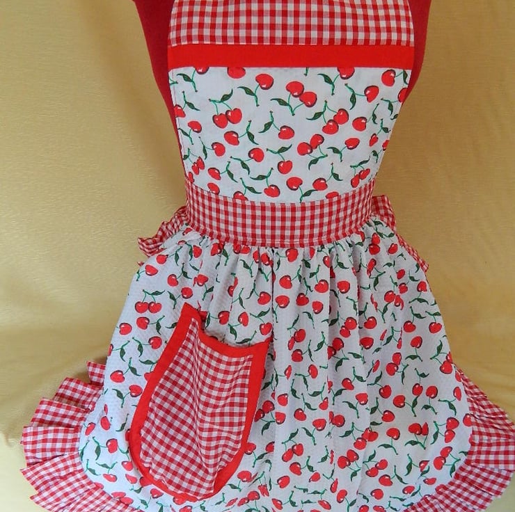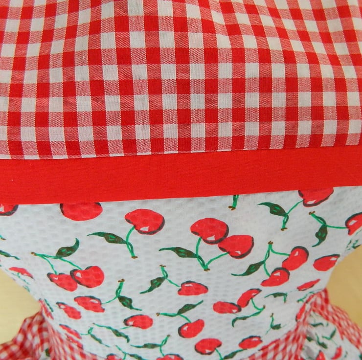Here we have a lovely polycotton red and white (cherries pattern) retro style apron, handmade in house to our own design. (see photos). Adjustable neck and waist ties so will fit up to a size 22.