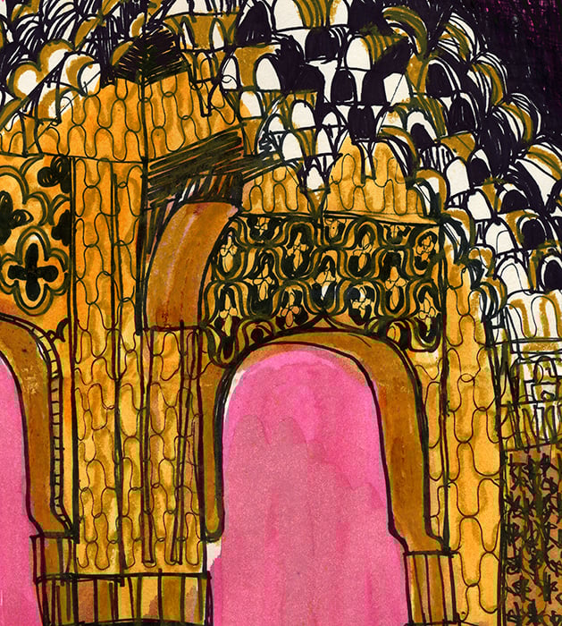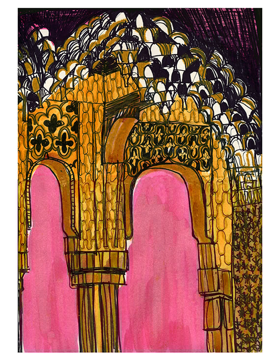 This drawing is of highly decorated arches leading to a courtyard, the sun was setting in a pink sky and the white decorative plaster was glowing golden. I used black pen, and ochre oil pastel with washes of ink to capture the glowing colours and shadows.
