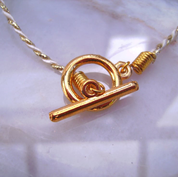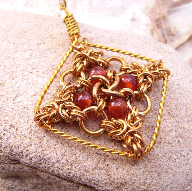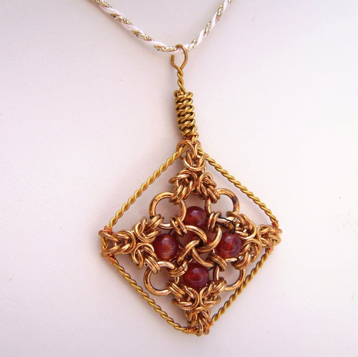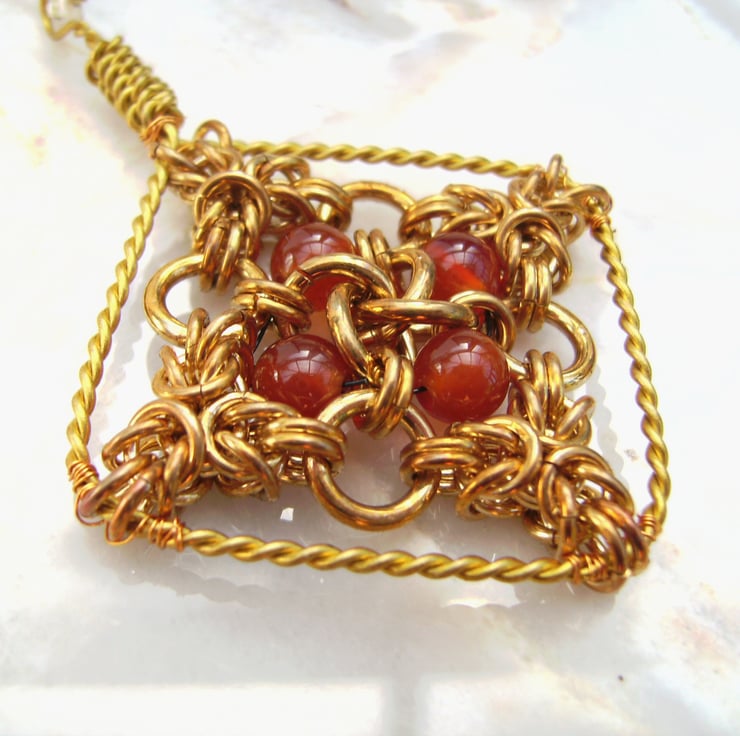 This 17 inch necklace has been created using 6mm carnelian beads & jewellers brass wire & jump rings. The design is based on the chainmaille quatrefoil (by Scott David Plumlee) & woven onto a twisted brass wire frame. A beading string attaches the beads to the piece. It is hung on white gold twisted cord & completed with a gold tone toggle clasp.