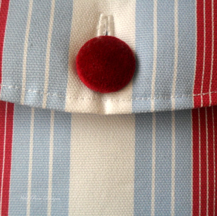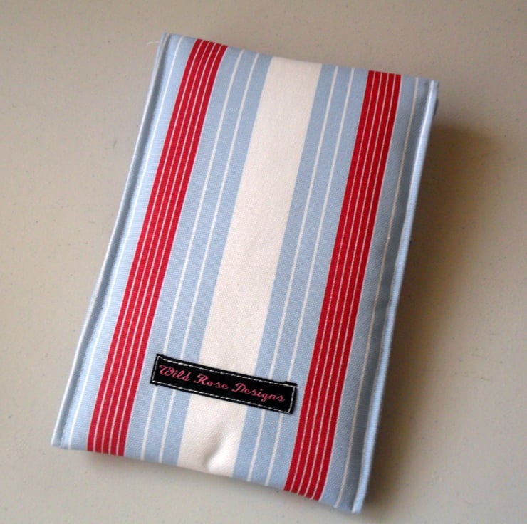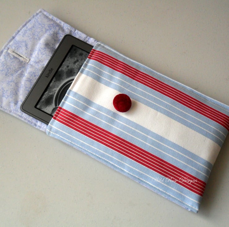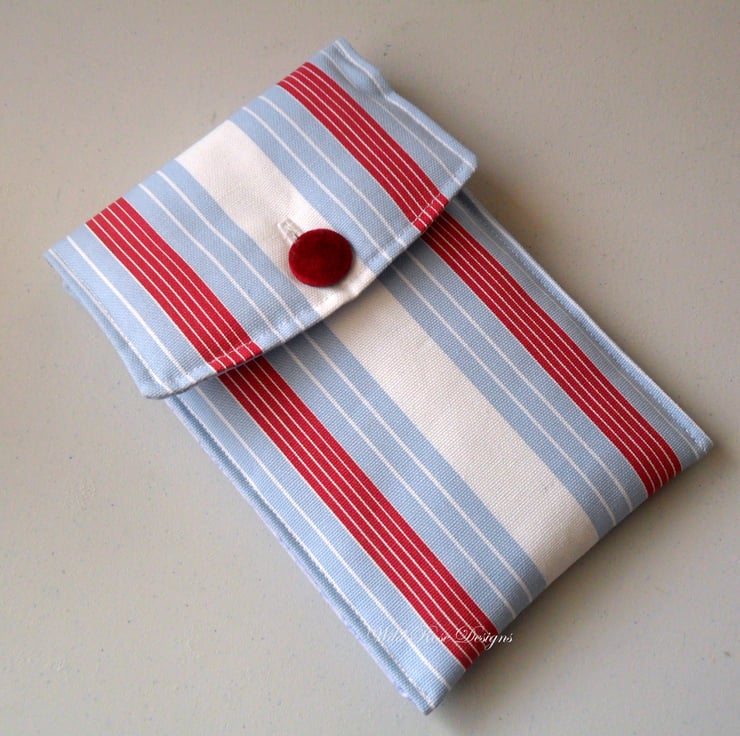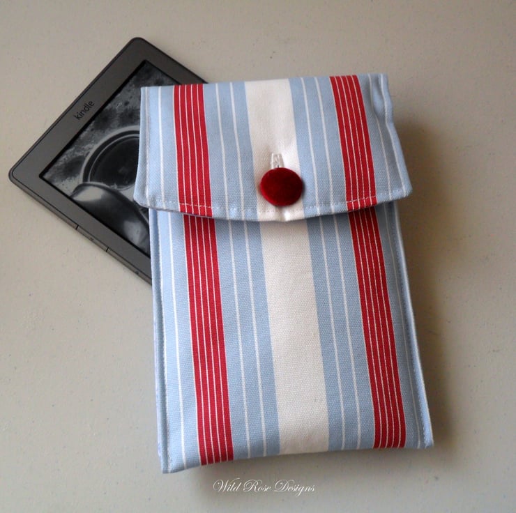 A Kindle case with a nautical feel, it is made in a red, white and blue striped cotton and is lined in a blue cotton print. The flap closes with a toning button, and there is a layer of wadding to protect your Kindle from bumps and scrapes. The cover is made to fit the standard Wifi model and measures 13.5cm x 20cm ( internal measurements are 12.5cm x 19cm). All measurements are approximate.