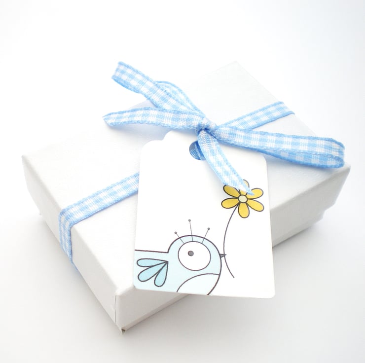 Your earrings will arrive in a little white box tied with a blue ribbon, ready for gift giving!