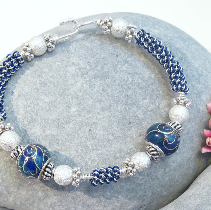Dark Blue Pandora Style cloisonnes, silver plated stardust beads and silver tibetan style beads wrapped with dark blue wire and with integral formed silver plated clasp.