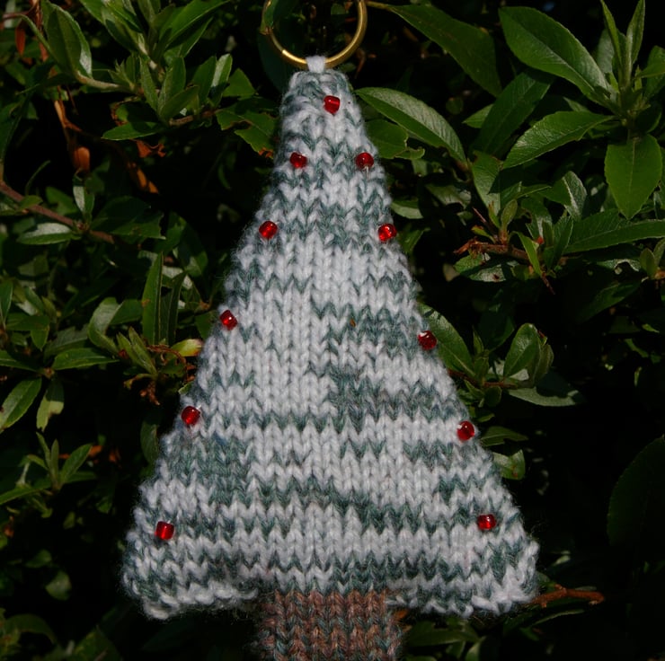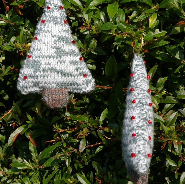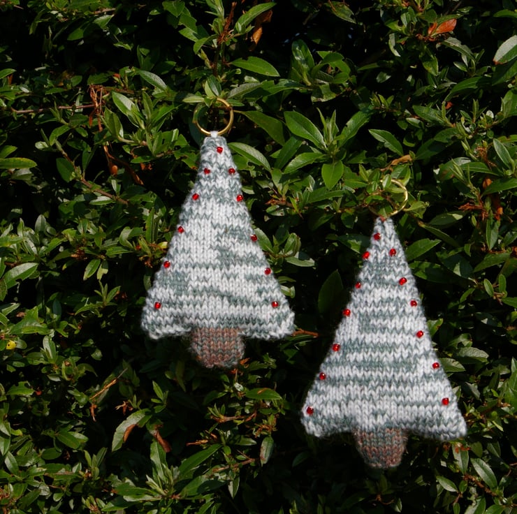 A pair of hand knitted two tone green Christmas trees. They are both carefully stuffed with a hypo allergenic stuffing to give them a soft plump feel. Both are decorated with hand-sewn red beads along the front and back edges. They are both topped with a metal ring.
