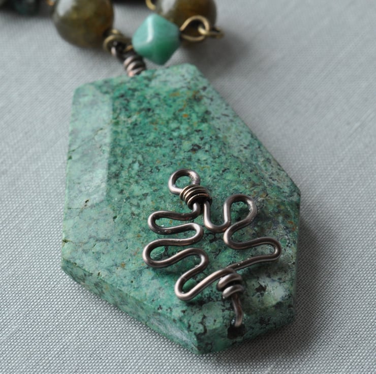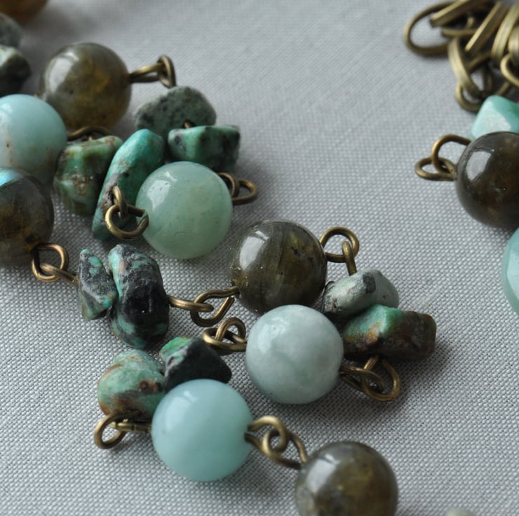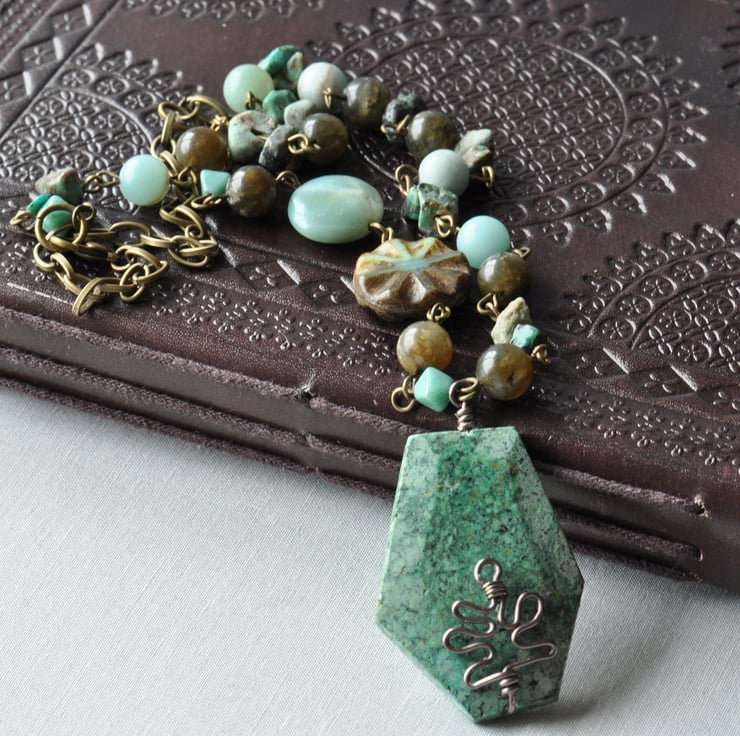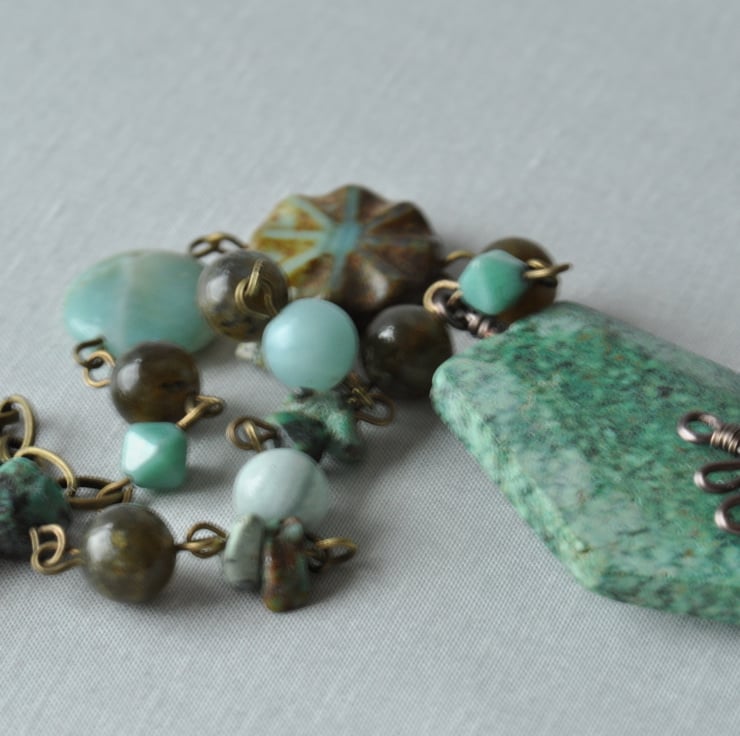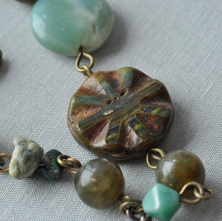 Beaded necklace with pendant of African Turquoise with wire flower design on front and beaded one side chain of African Turquoise chips, Labradorite rounds and Amazonite rounds and the other side dark aqua bicone beads, Amazonite coin bead, Labradorite rounds and a stunning Aqua Czech Picasso finish coin bead with antique gold plated curb chain.