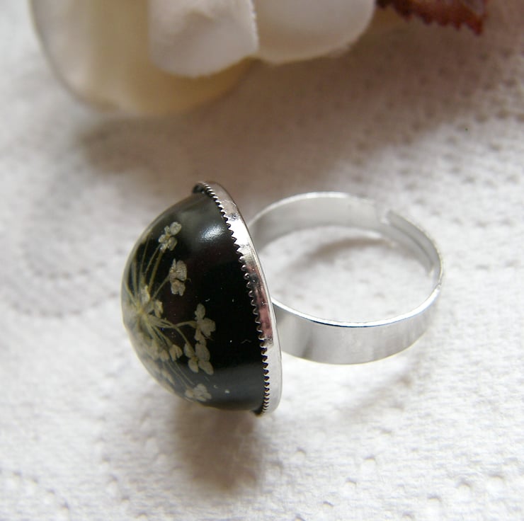 Description: I have very carefully sealed this white Queen Anne's Lace flower in black non - toxic uv resistant resin. I have then mounted the high domed lace flower cabochon onto a silver plated expandable ring, one size to fit all. (so pretty, dainty and feminine:) The white lace flower is so eye catching against the black resin. Would make a lovely gift:)