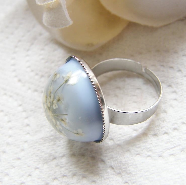 Description: I have very carefully sealed this white Queen Anne's Lace flower in ice blue non - toxic uv resistant resin. I have then mounted the high domed lace flower cabochon onto a silver plated expandable ring, one size to fit all. (so pretty, dainty and feminine:) Would make a lovely gift:)