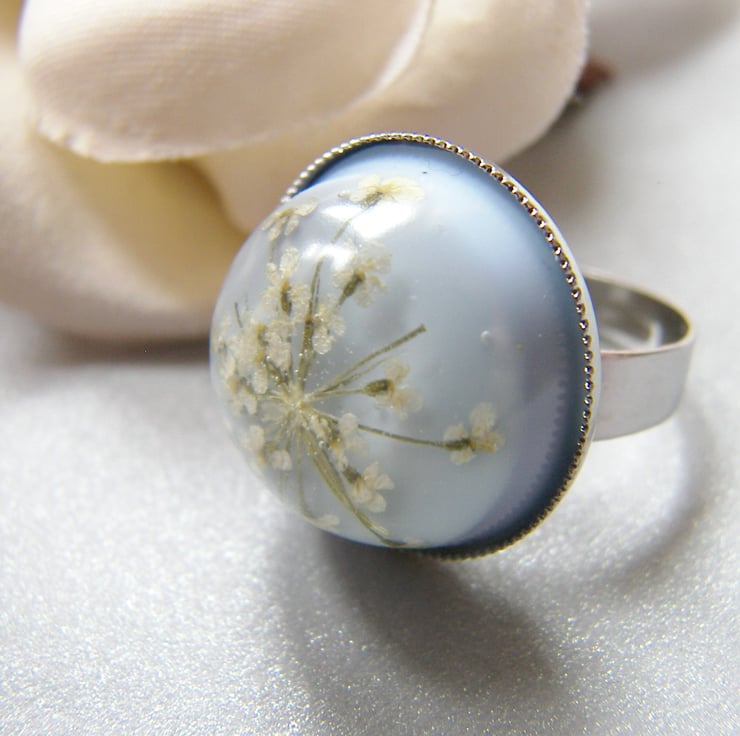 Real Queen Anne's Lace Flower Blue Ring - SNOWFLAKE