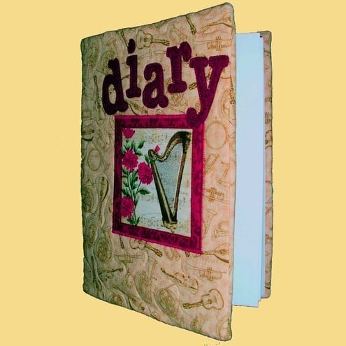 The cover is made from a musical printed fabric, which has the word diary and a harp panel appliqued on.. The diary is A5 size, refills are easily available, for the next year.