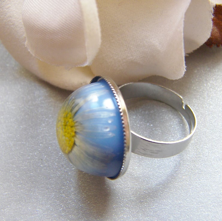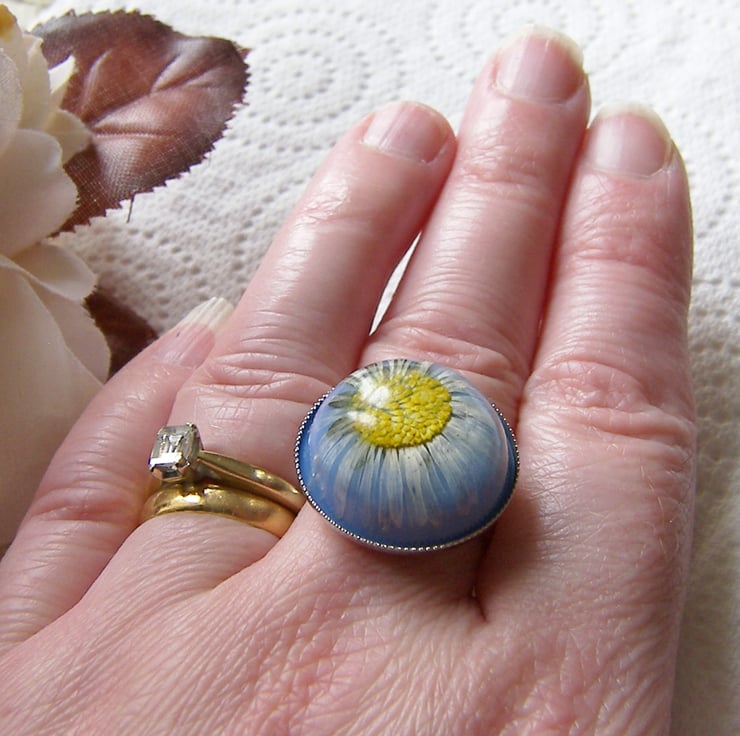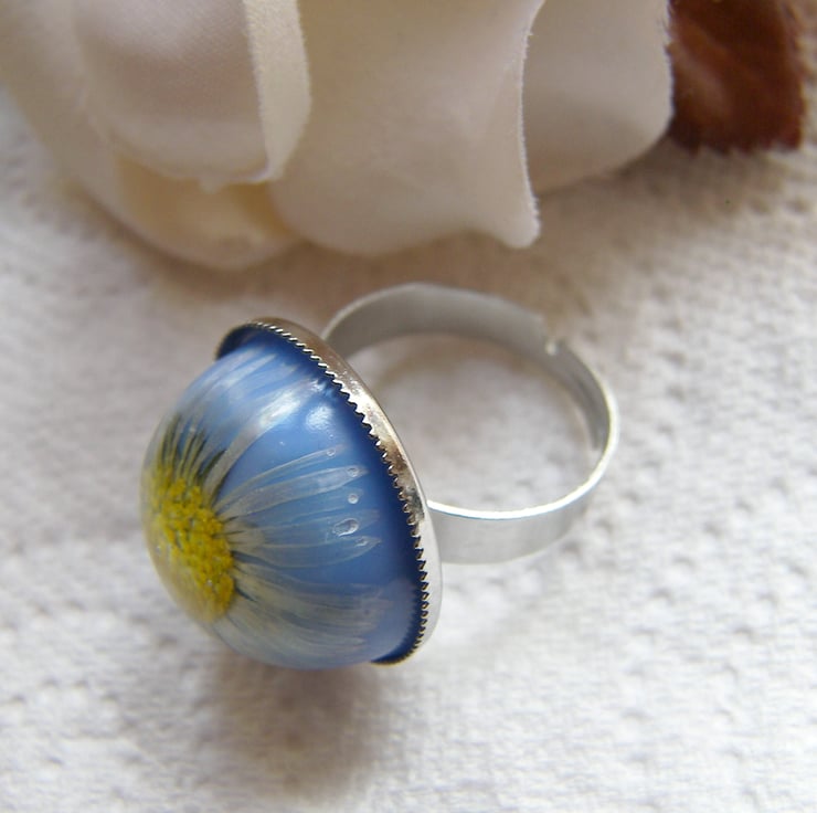 Description: I have very carefully dried and treated this daisy to retain its lovely color before adding to blue non - toxic uv resistant resin. I have then mounted the high domed daisy cabochon onto a silver plated expandable ring, one size to fit all. (so pretty and feminine:) Would make a lovely gift:)