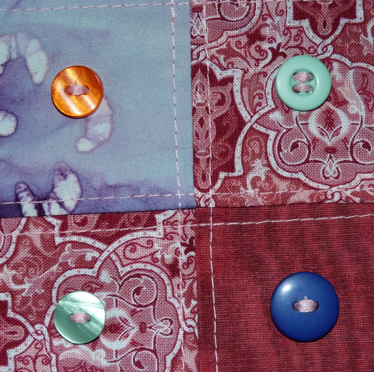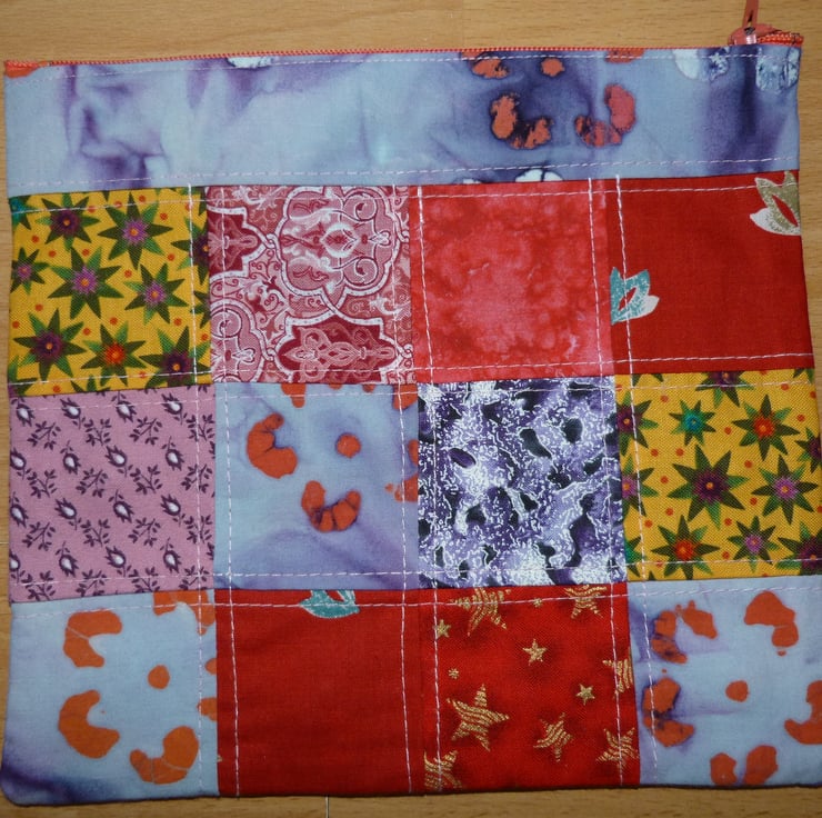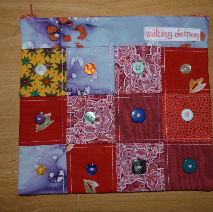 I have designed this large zipped purse with patchwork squares, embellished with decorative buttons on the front. It is quilted to accentuate the square patchwork pattern.The purse is quite large, measuring 7.25"h x 8"w, so could be used as a make-up purse, pencil case or a travelling sewing supply case.