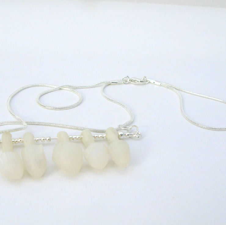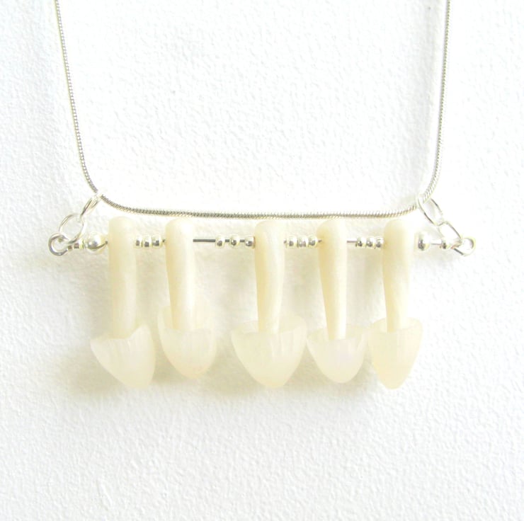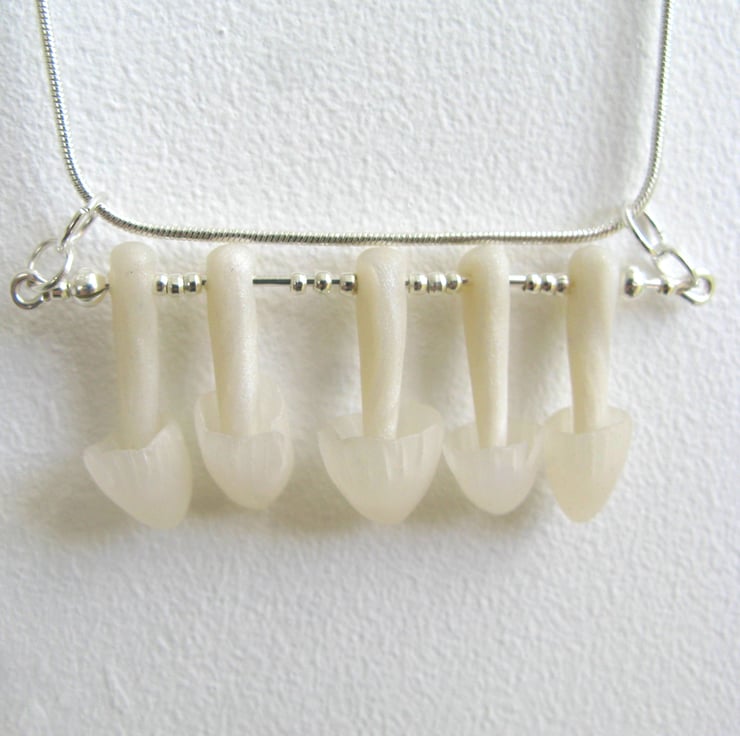 A delicate row or fairy ring toadstools on a silver plated bar, hung on a silver plated snake chain.