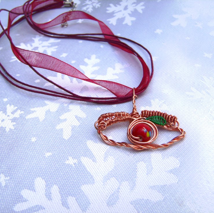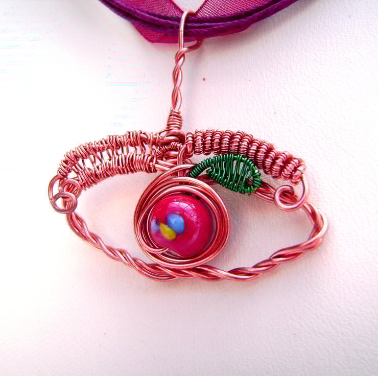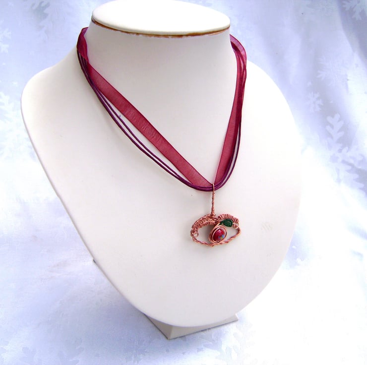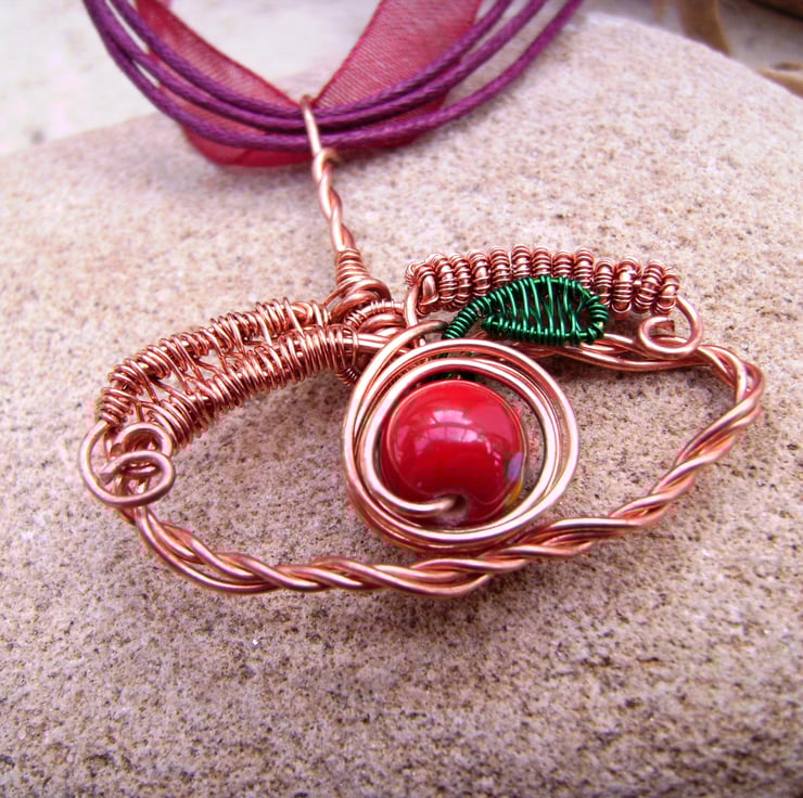 This highly unique pendant necklace has been created by hand using copper wire & a red glass bead. It is hung on a 16 to 18 inch long ribbon & cord choker style necklace. The bead has a green coated copper wire leaf so that it looks like an apple in the copper 'eye.' The approximate size of the pendant is 1 x 1.5 inches. It will make a lovely gift for whoever is 'the apple of your eye!'
